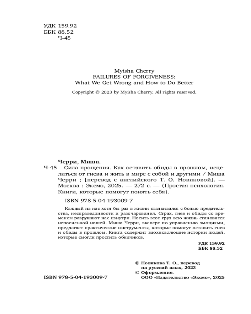 Серия: Простая психология. Книги, которые помогут понять себя Многие из нас сталкивались с болью предательства, несправедливости, разочарования. Непрощенные обиды не проходят бесследно и лишают нас радости и внутреннего спокойствия. Миша Черри, эксперт по управлению эмоциями, предлагает практические инструменты, которые помогут оставить гнев и обиды в прошлом. |
