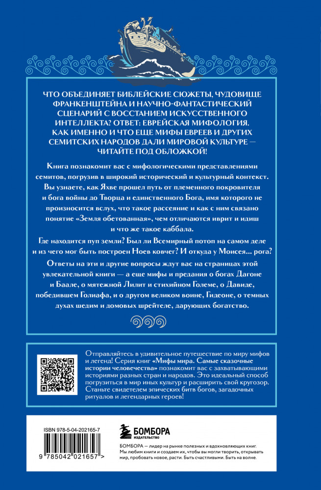 Серия: Мифы мира. Самые сказочные истории человечества Древняя еврейская мифология стала основой для множества религиозных представлений, литературных сюжетов и культурных традиций, которые и сегодня остаются влиятельны для множества людей по всему миру. Книга «Еврейские мифы» познакомит вас с историей, преданиями, традициями и праздниками евреев, а также расскажет, как еврейская мифология связана с шумеро-аккадскими, финикийскими и другими древнейшими мифами Ближнего Востока. Вы узнаете, в чем особенность еврейских мифов и преданий, как из раннесемитской мифологии постепенно выделялся культ Яхве и почему Он изначально сосуществовал с другими богами ханаанского пантеона — Элем, Иштар, Баалом.