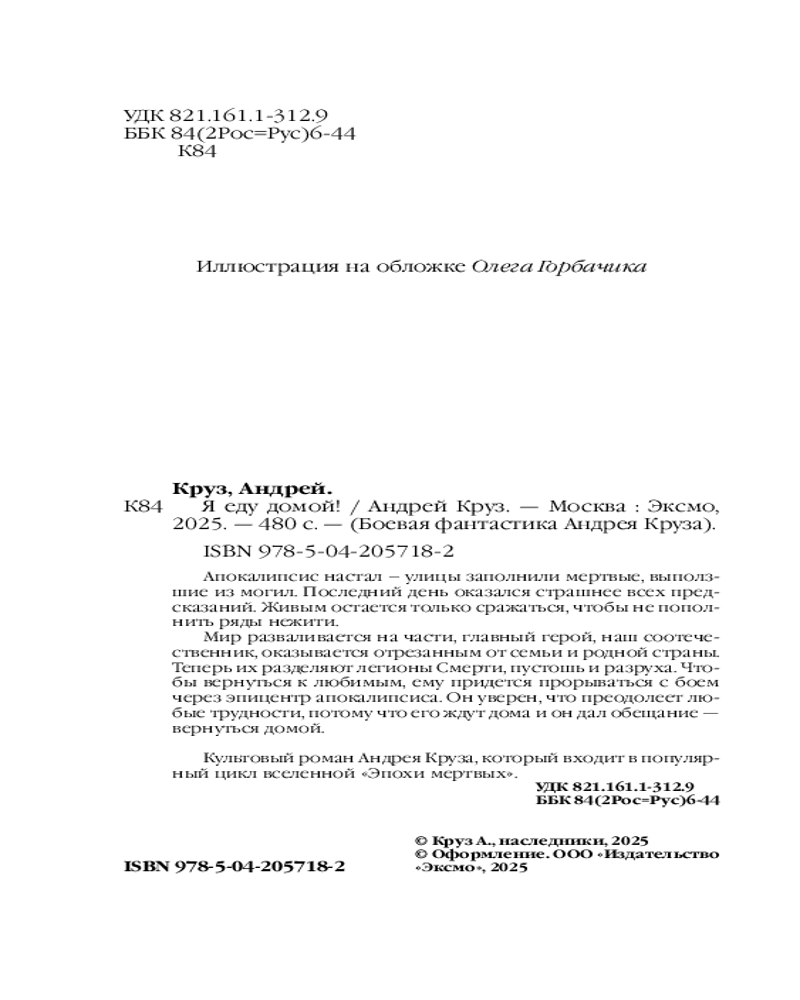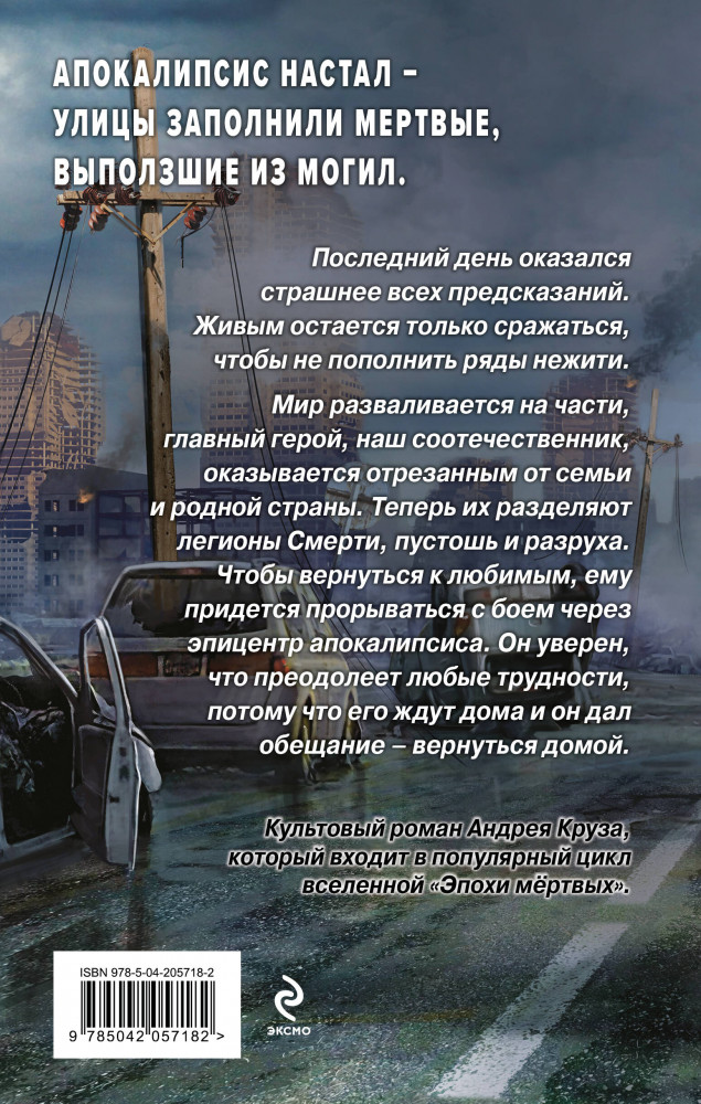 Серия: Боевая фантастика Андрея Круза Апокалипсис настал — улицы заполнили мертвые, выползшие из могил. Последний день оказался страшнее всех предсказаний. Живым остается только сражаться, чтобы не пополнить ряды нежити. Мир разваливается на части, главный герой, наш соотечественник, оказывается отрезанным от семьи и родной страны. Теперь их разделяют легионы смерти, пустошь и разруха. Чтобы вернуться к любимым, ему придется прорываться с боем через эпицентр апокалипсиса. Он уверен, что преодолеет любые трудности, потому что его ждут дома и он дал обещание — вернуться домой. |