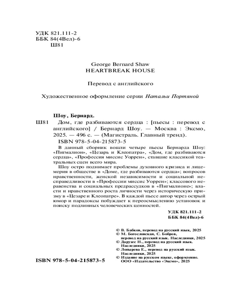 Серия: Магистраль. Главный тренд В данный сборник вошли пьесы 4 пьесы Бернарда Шоу: «Пигмалион», «Цезарь и Клеопатра», «Дом, где разбиваются сердца», «Профессия миссис Уоррен», ставшие классикой театральных сцен всего мира. Входит в университетскую программу многих гуманитарных направлений. Шоу остро поднимает проблемы духовного кризиса и лицемерия в обществе в «Дом, где разбиваются сердца»; вопросов нравственности, женской независимости и социальной несправедливости в «Профессия миссис Уоррен»; классового неравенства и социальных предрассудков в «Пигмалионе»; власти и нравственного роста личности через историческую призму в «Цезарь и Клеопатра». В каждой пьесе автор через острый юмор и парадоксы побуждает к переосмыслению установок и поиску подлинных человеческих ценностей. |