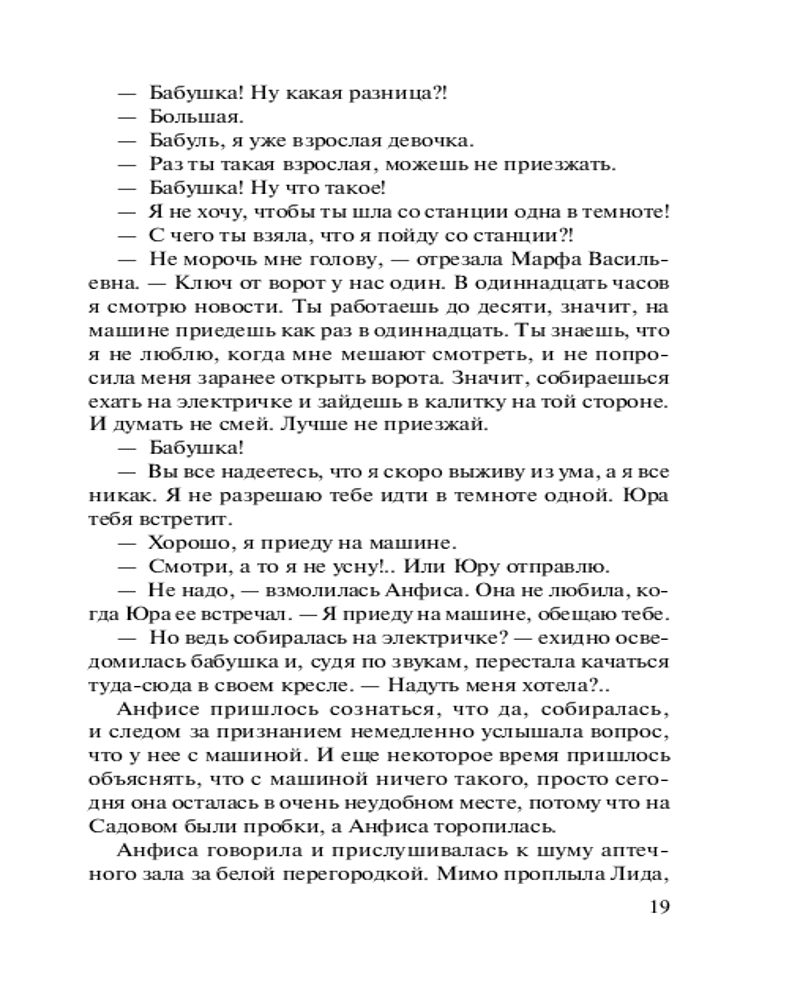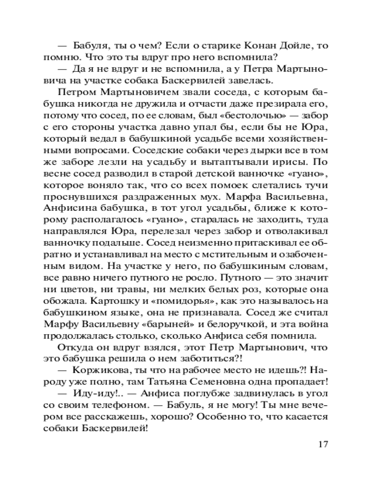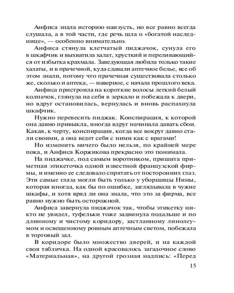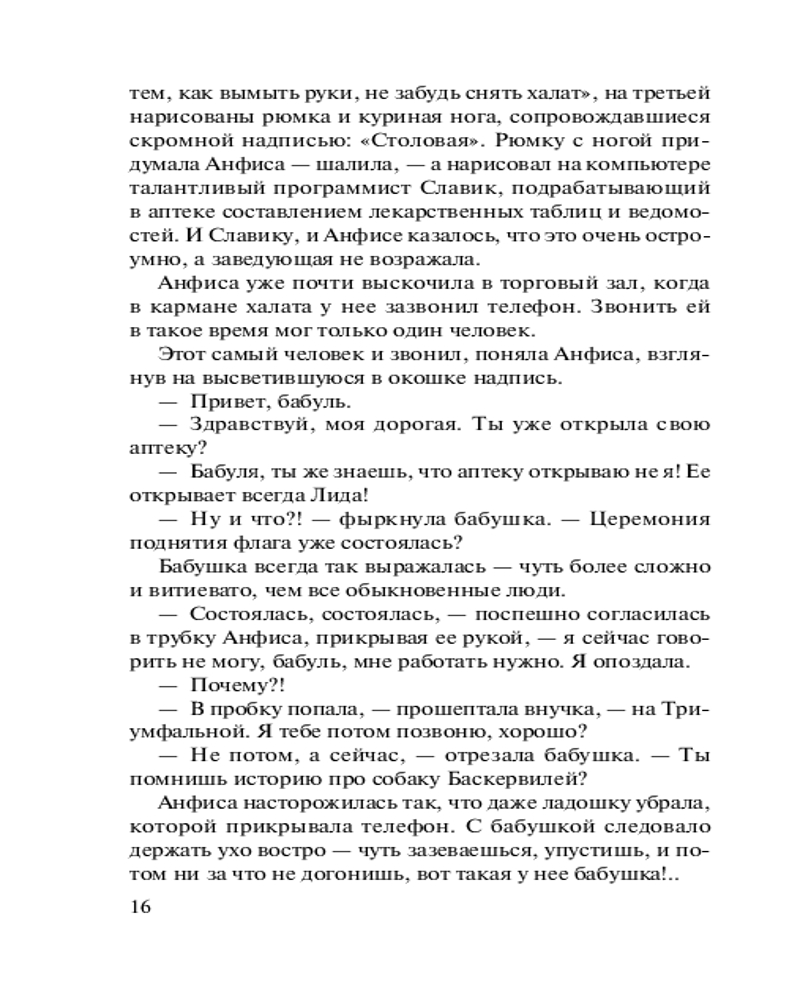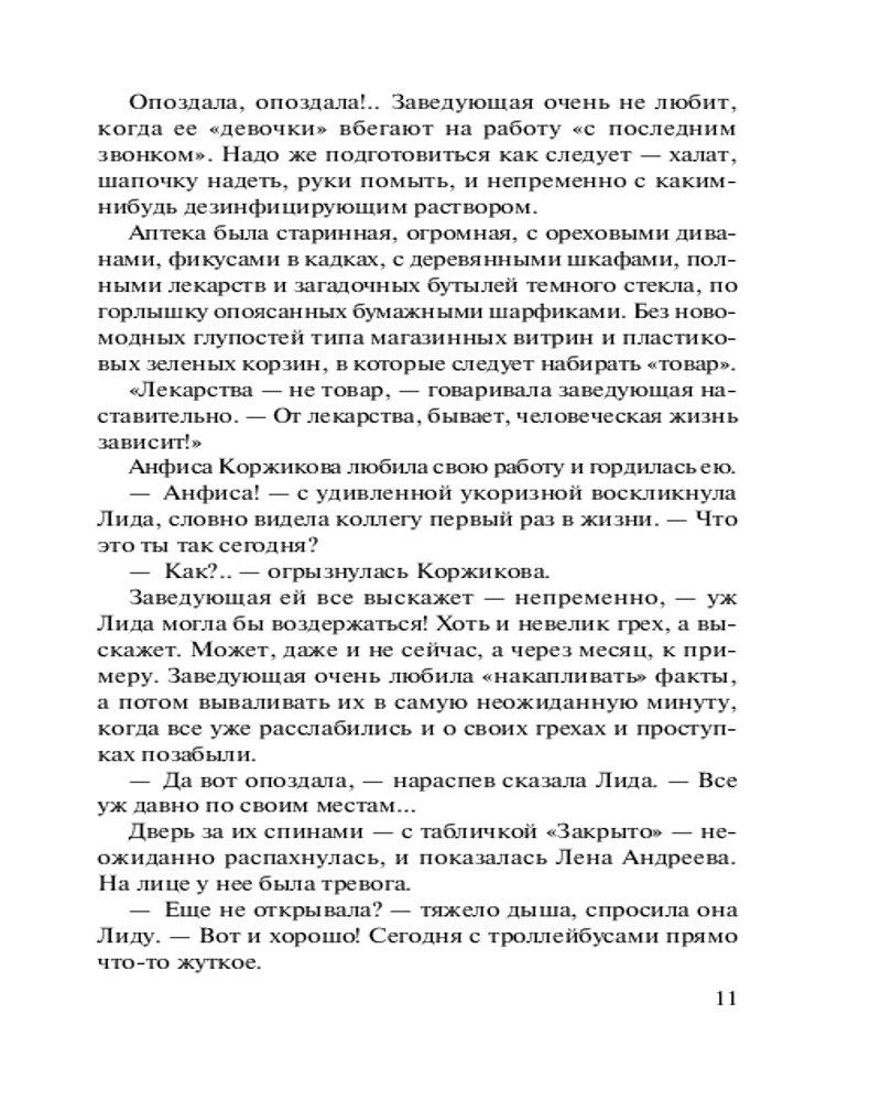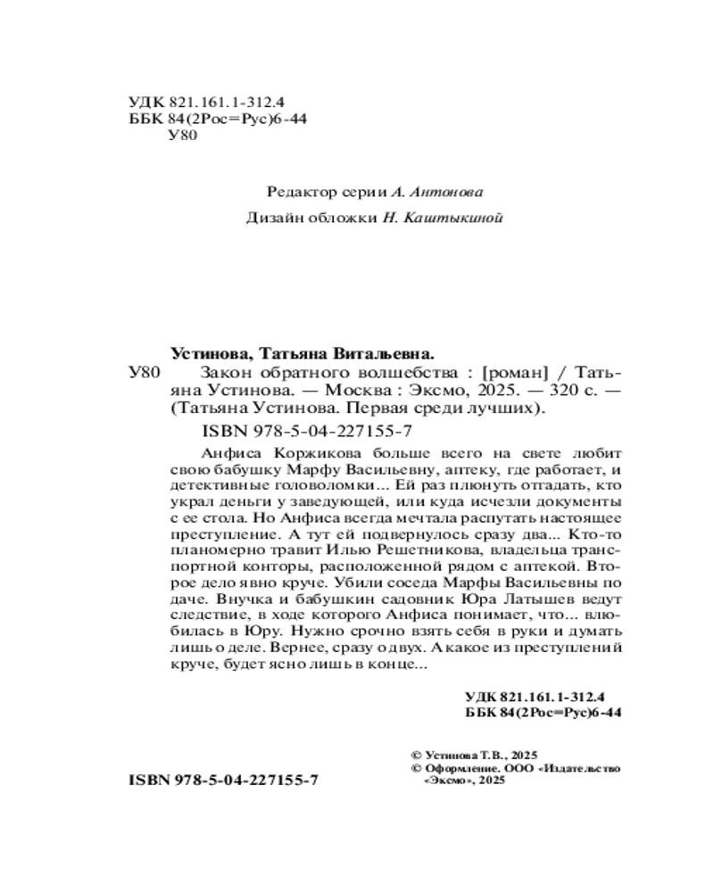 Серия: Татьяна Устинова. Первая среди лучших (обложка) Анфиса Коржикова больше всего на свете любит свою бабушку Марфу Васильевну, аптеку, где работает, и детективные головоломки... Ей раз плюнуть отгадать, кто украл деньги у заведующей или куда исчезли документы с ее стола. Но Анфиса всегда мечтала распутать настоящее преступление. А тут ей подвернулось сразу два... Кто-то планомерно травит Илью Решетникова, владельца транспортной конторы, расположенной рядом с аптекой. Второе дело явно круче. Убили соседа Марфы Васильевны по даче. Внучка и бабушкин садовник Юра Латышев ведут следствие, в ходе которого Анфиса понимает, что... влюбилась в Юру. Нужно срочно взять себя в руки и думать лишь о деле. Вернее, сразу о двух. А какое из преступлений круче, будет ясно лишь в конце... |