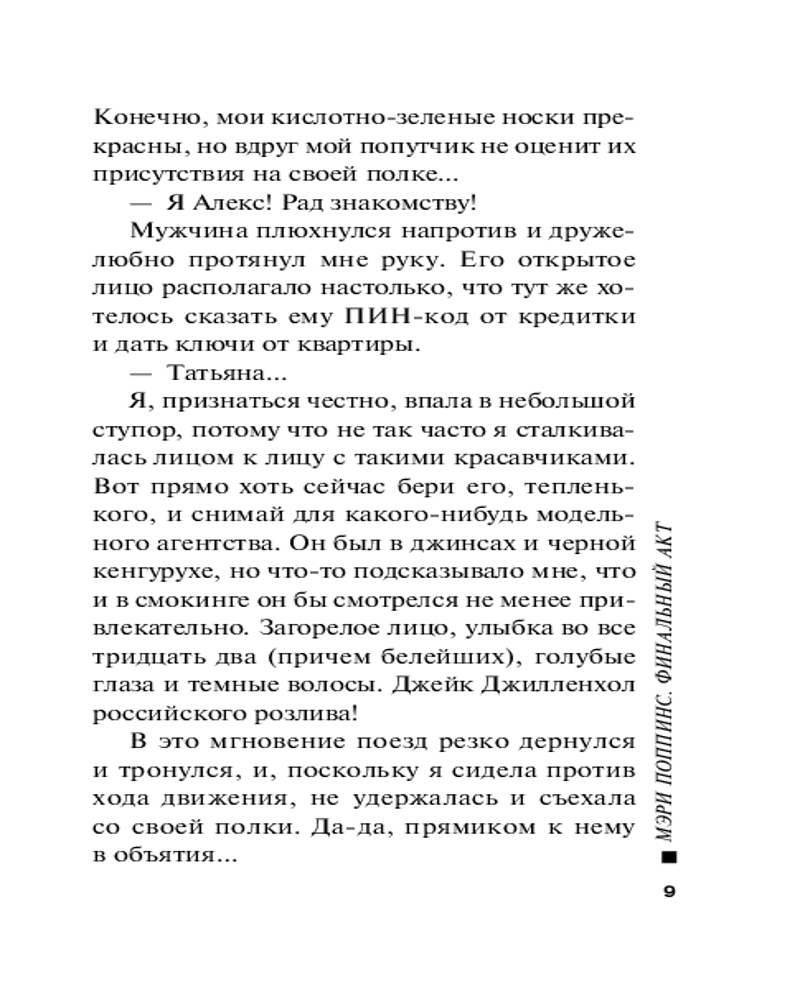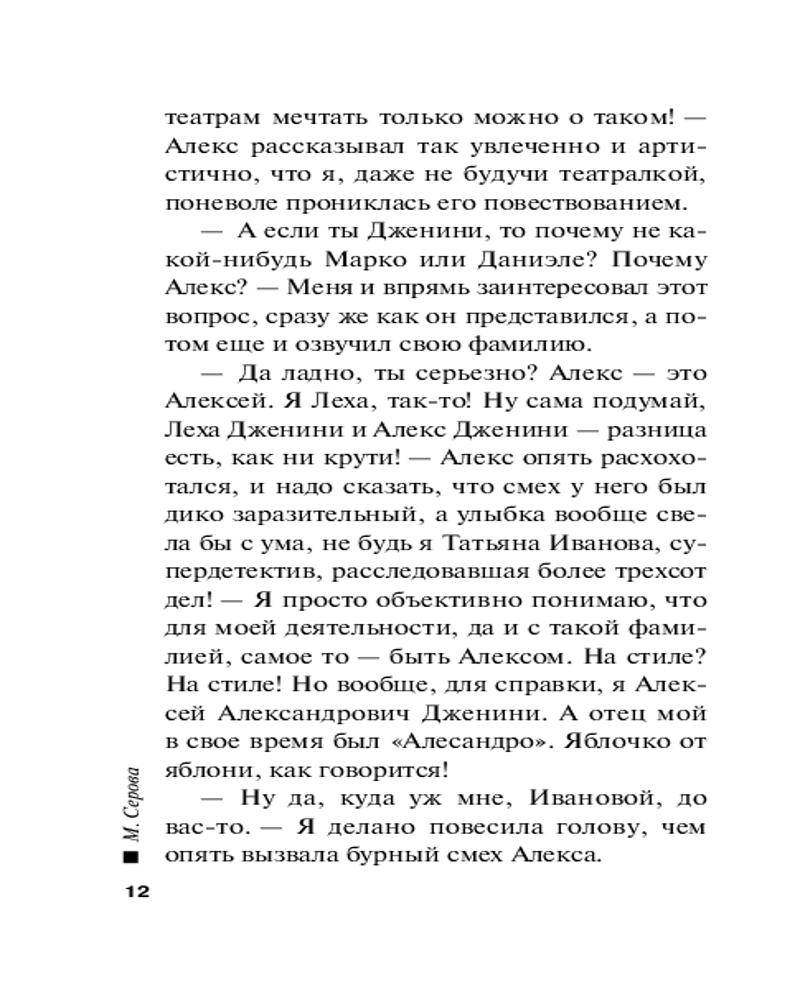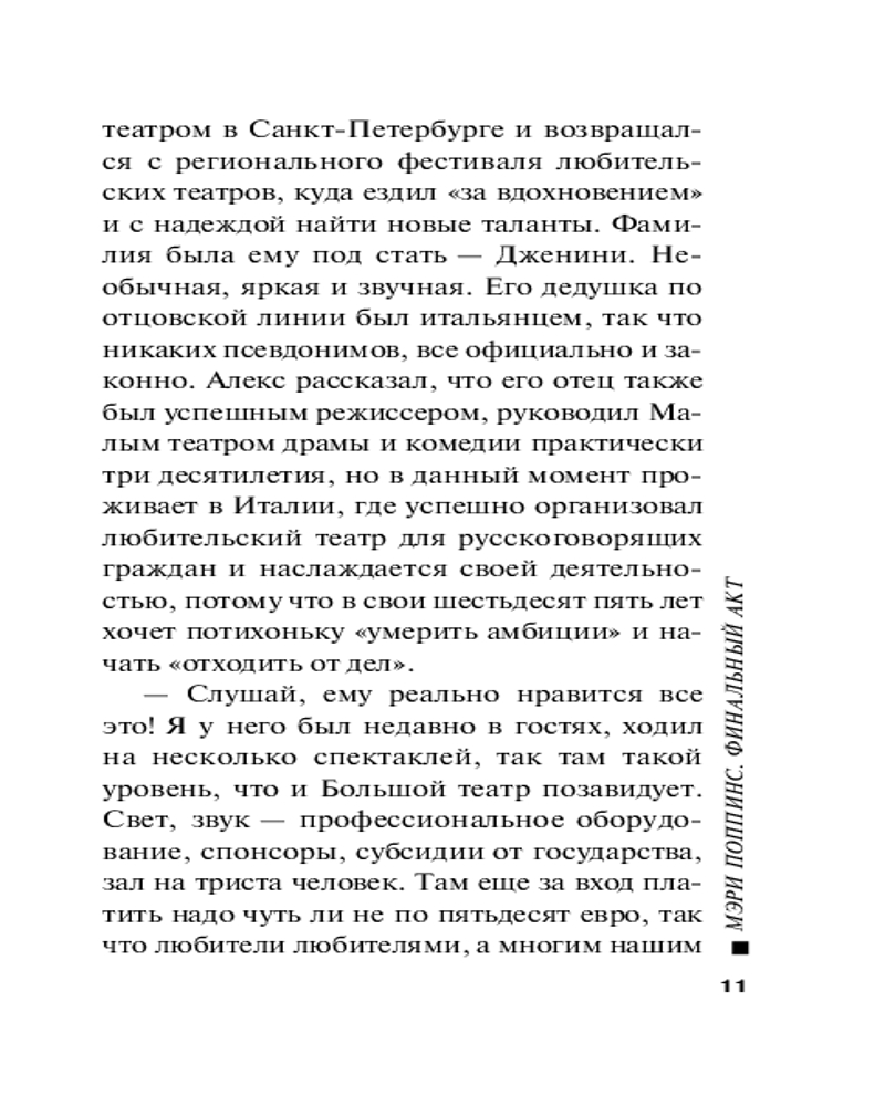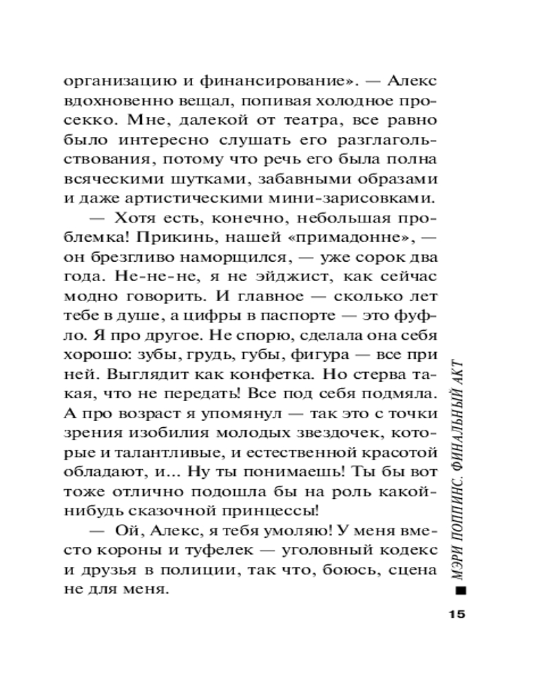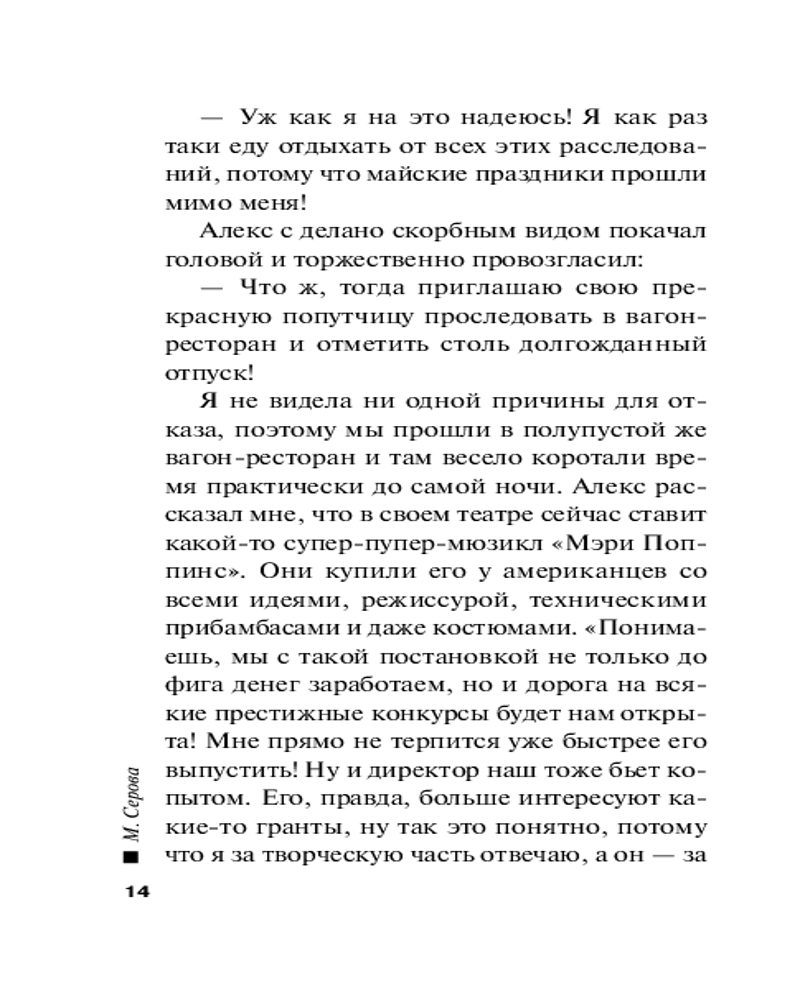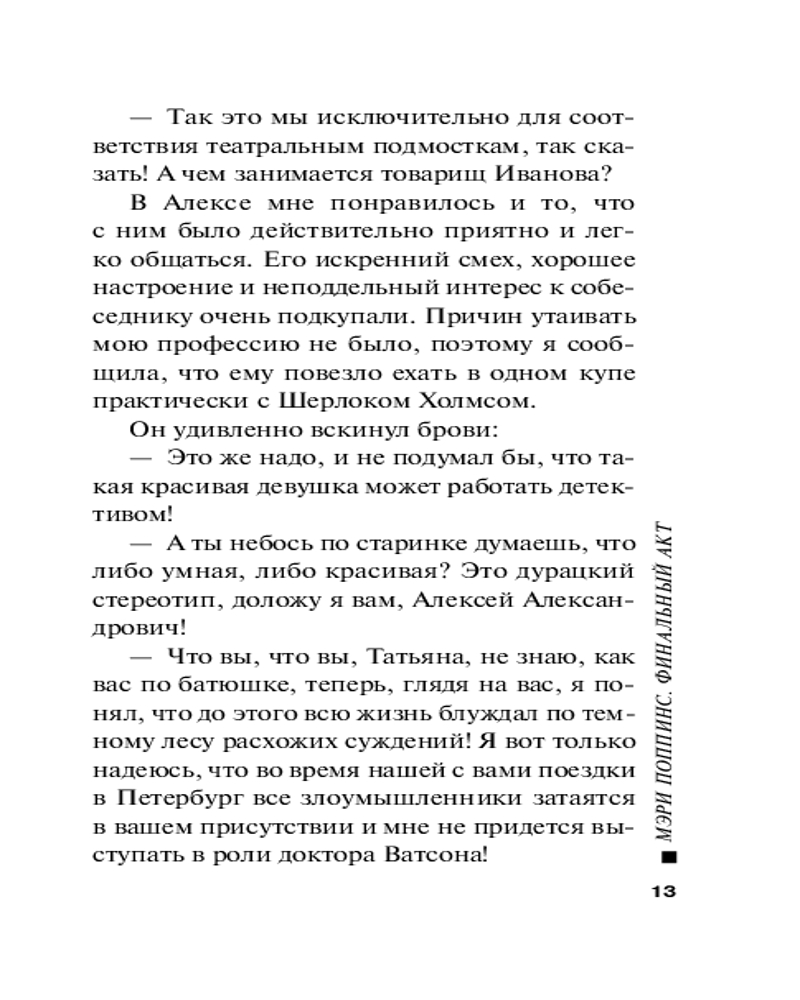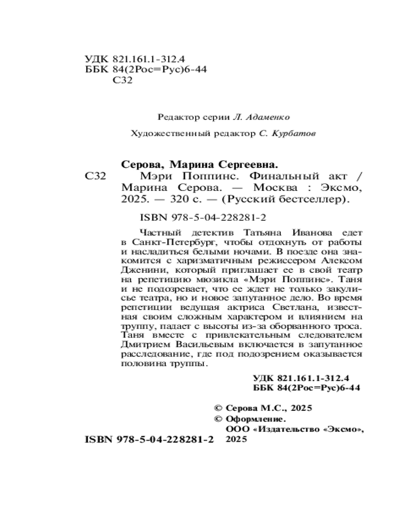 Серия: Русский бестселлер (обложка) Частный детектив Татьяна Иванова едет в Санкт-Петербург, чтобы отдохнуть от работы и насладиться белыми ночами. В поезде она знакомится с харизматичным режиссером Алексом Дженини, который приглашает ее в свой театр на репетицию мюзикла «Мэри Поппинс». Таня и не подозревает, что ее ждет не только закулисье театра, но и новое запутанное дело. Во время репетиции ведущая актриса Светлана, известная своим сложным характером и влиянием на труппу, падает с высоты из-за оборванного троса. Таня, вместе с привлекательным следователем Дмитрием Васильевым, включается в запутанное расследование, где под подозрением оказывается половина труппы. |