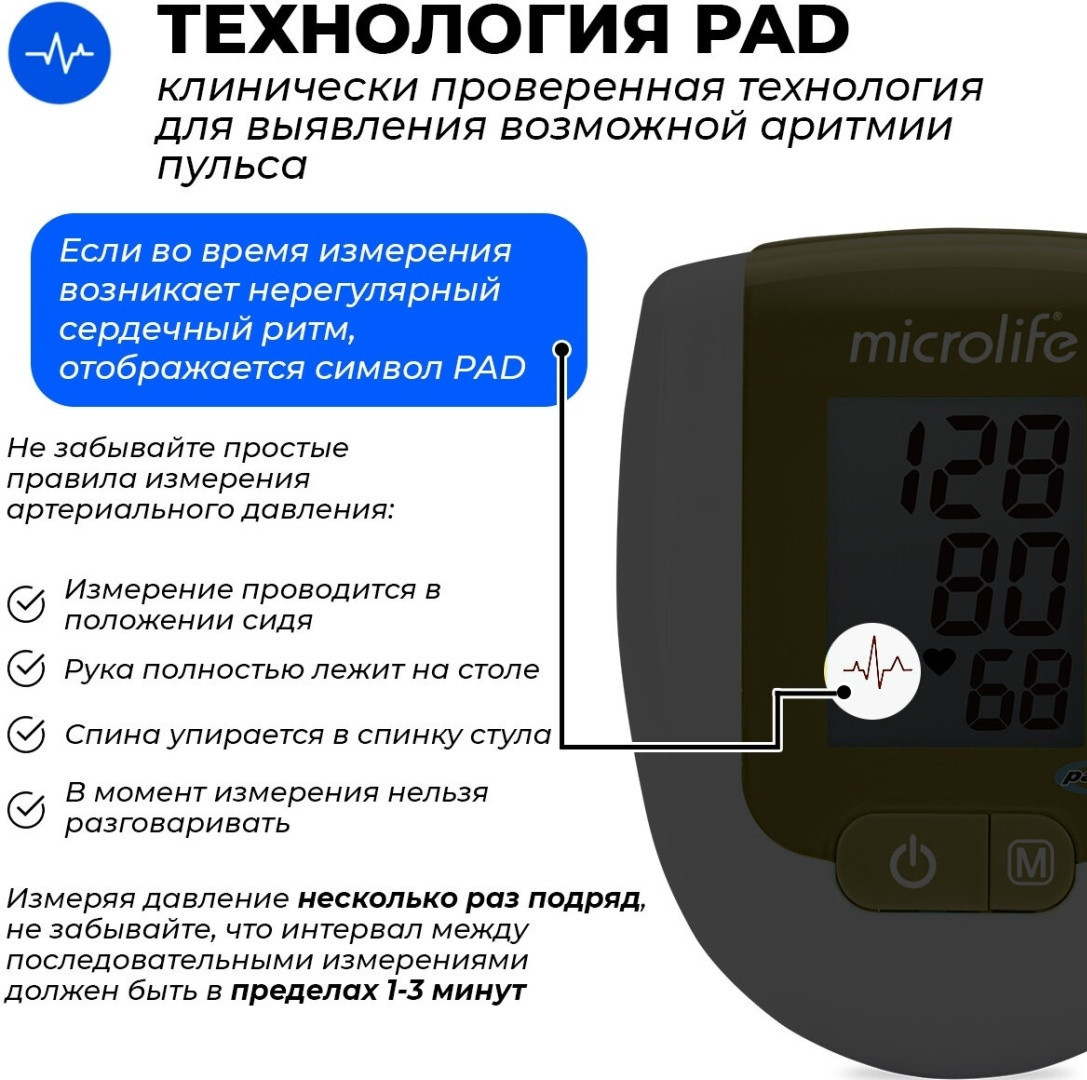 Microlife BP 3AG1 - это осциллометрический тонометр предназначен для измерения неинвазивного артериального давления у людей старше 12 лет. Он клинически проверен среди пациентов с гипертонической болезнью, гипотонией, диабетом, беременностью, преэклампсией, атеросклерозом, почечной болезнью в конечной стадии, ожирением и пожилыми людьми. Прибор оснащен PAD-технологией диагностики аритмии, которая распознает самые первые симптомы этого заболевания, отличает действительные признаки аритмии от схожих симптомов, вызванных, например, движениями руки во время измерения. Большой трехстрочный дисплей, простое управление одной кнопкой, память на 30 измерений - все это, дополнительные преимущества тонометра Microlife BP 3AG1.