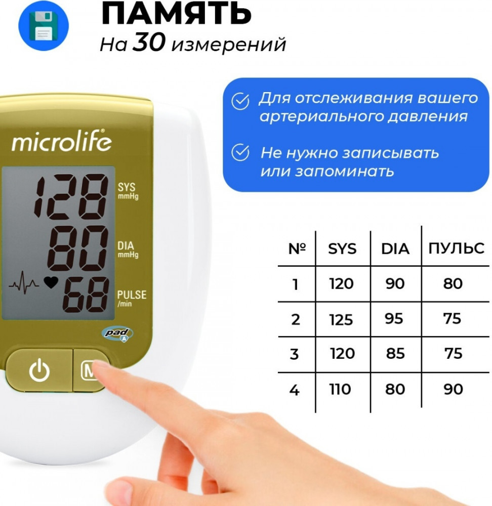 • память на 30 измерений с отметкой даты и времени — удобно отслеживать артериальное давление;