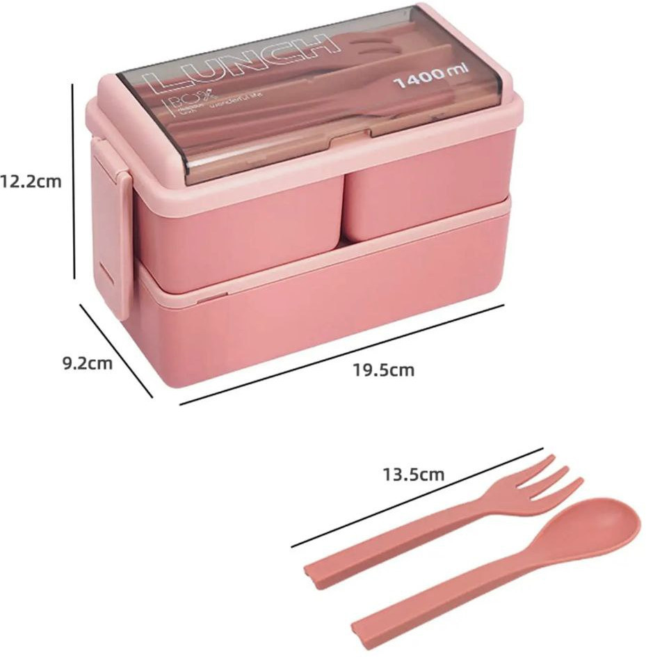 Двухуровневый ланчбокс с отделениями для хранения еды и продуктов включает 3 герметичных бокса, установленных друг на друга и зафиксированных усиленными защелками. Верхняя часть ланч-бокса с отсеками имеет отделение с прозрачной крышкой для хранения столовых приборов, а также комплект в виде ложки и вилки. Данную крышку можно использовать в качестве подставки для смартфона. При производстве использован высококачественный пищевой пластик.