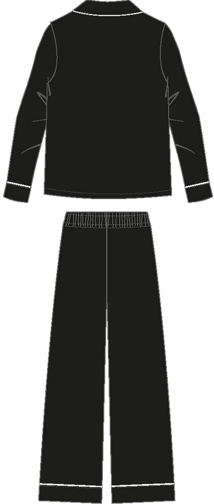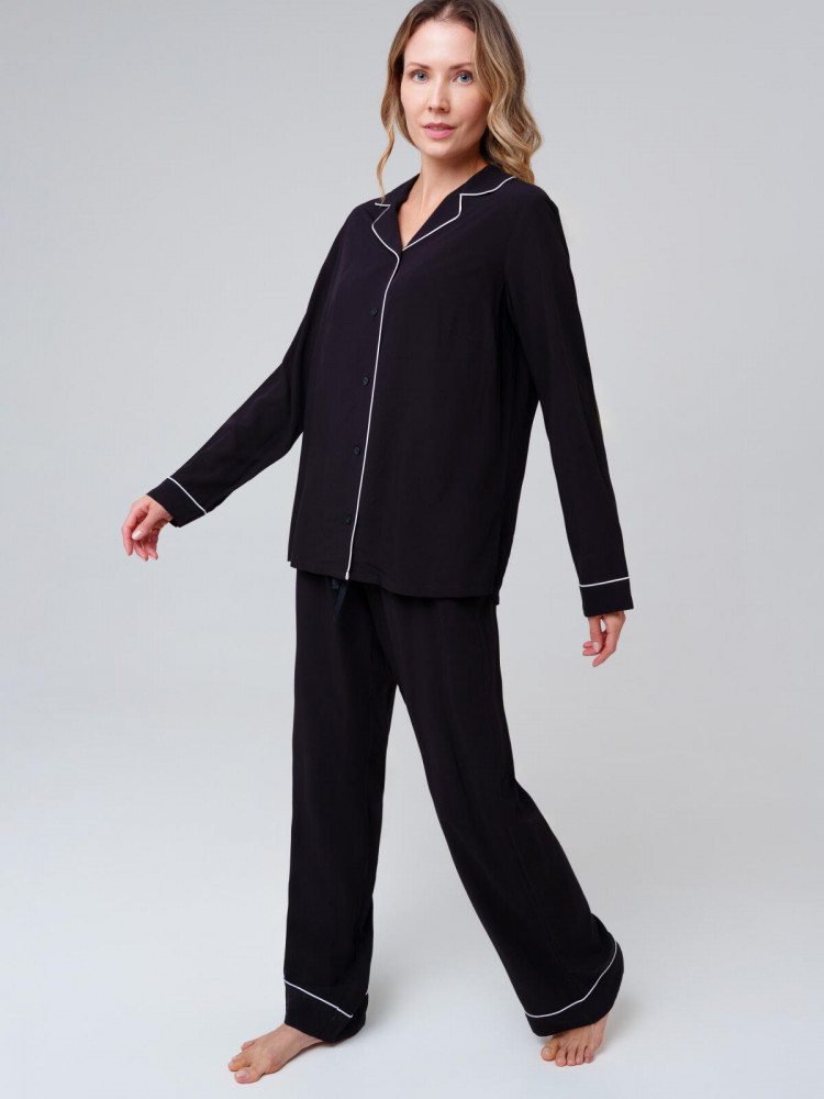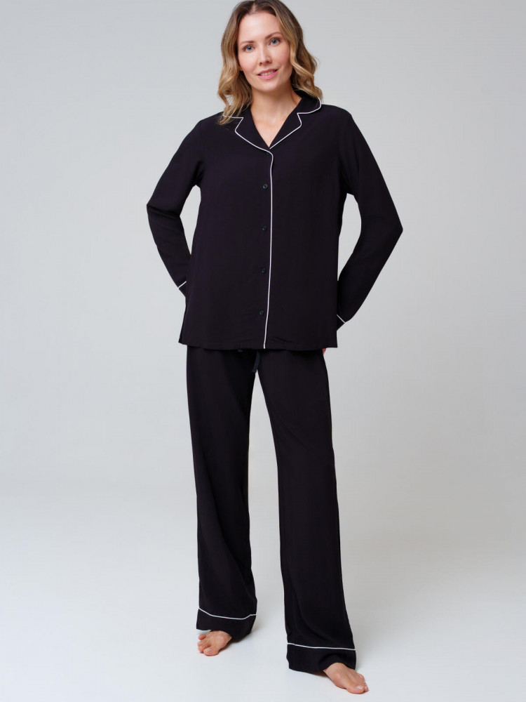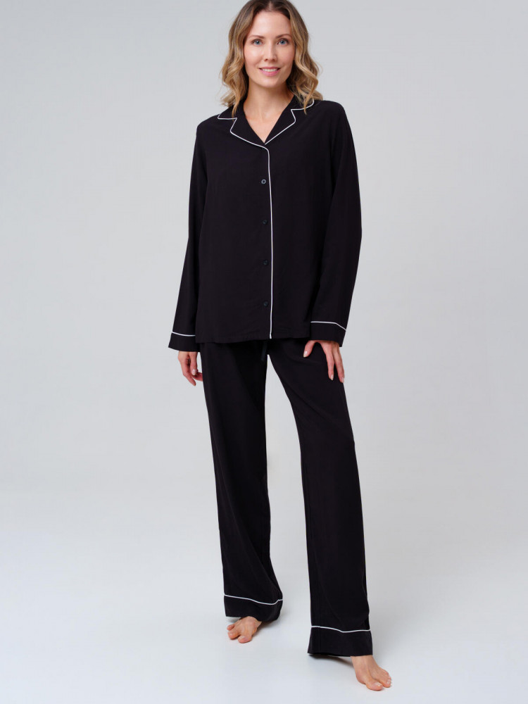 Женская пижама. Рубашка и брюки из 100% вискозы. Рубашка с застежкой на пуговицы. Штаны на резинке со шнурком. Функциональные боковые карманы.