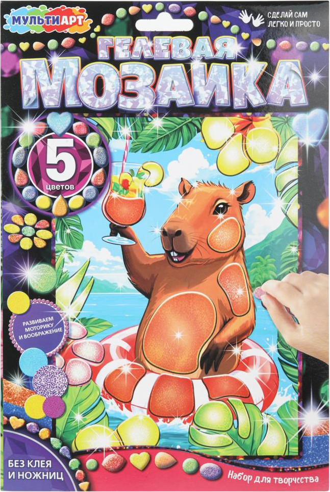Набор для творчества — гелевая мозаика «Капибара» ТМ «Мульти Арт» — отличный подарок для вашего ребёнка, который будет способствовать развитию его творческих способностей. С помощью этого набора маленький фантазёр сможет самостоятельно создать необычную объёмную аппликацию с изображением милой капибары. Для этого нужно просто освободить гелевые детали от подложки и приклеить в нужное место на основе. Готовую поделку можно подарить близким или использовать для украшения интерьера.