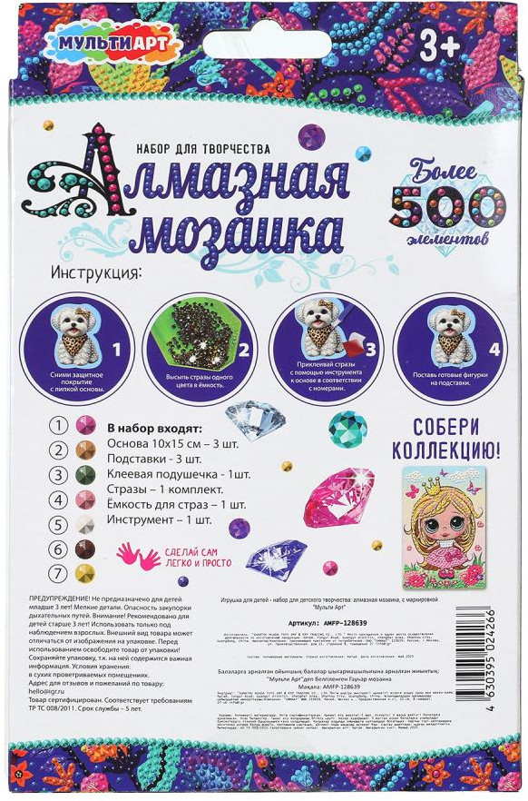 Набор для детского творчества — фигурная кристальная мозаика на подставке «Стильные щенки» ТМ «Мульти Арт» — отличный подарок для ребёнка, который будет способствовать развитию его творческих способностей. При помощи этого набора юные творцы смогут создать красивые поделки в виде очаровательных собачек, декорированные сверкающими стразами. Блестящие фигурки устанавливаются на специальные подставки, их можно подарить близким или использовать для украшения комнаты. |