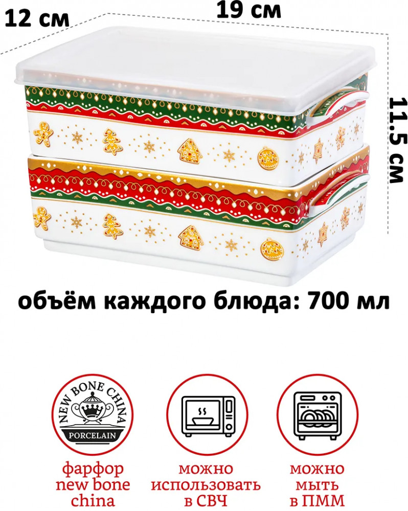Серия: Новогодняя елка Набор 2 блюд для холодца из серии «Новогодняя ёлка» от Elan Gallery предназначен для приготовления и эстетичной подачи ваших любимых блюд. Размер каждого изделия — 19×12×11,5 см, объём — 700 мл. Общий объём — 1400 мл. Выполнены из фарфора нового поколения new bone china, сочетающего в себе изящность и высокую прочность. Такие изделия легко отмываются, поэтому сохраняют привлекательный вид и практичны в использовании. Плотная структура материала позволяет посуде дольше сохранять температуру блюд и напитков. От других видов костяного фарфора new bone china отличается большей экологичностью в производстве. Поверхность украшена широкой цветной окантовкой, изображением пушистой наряженной ёлочки, узором из снежинок и имбирных пряников. Крышка выполнена из пластика. Вместительные контейнеры подойдут для сельди под шубой, салатов и плова, и помогут порадовать себя или гостей за праздничным столом. Используйте их в качестве салатников или глубоких сервировочных блюд для эстетичной подачи закусок из мяса и рыбы. |