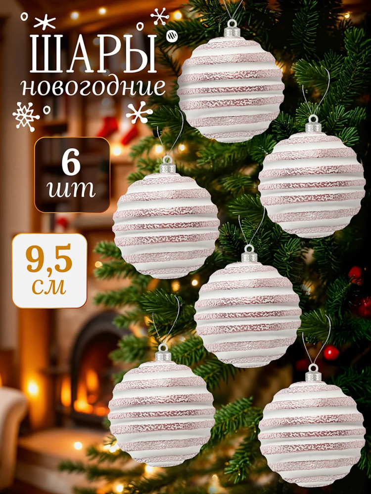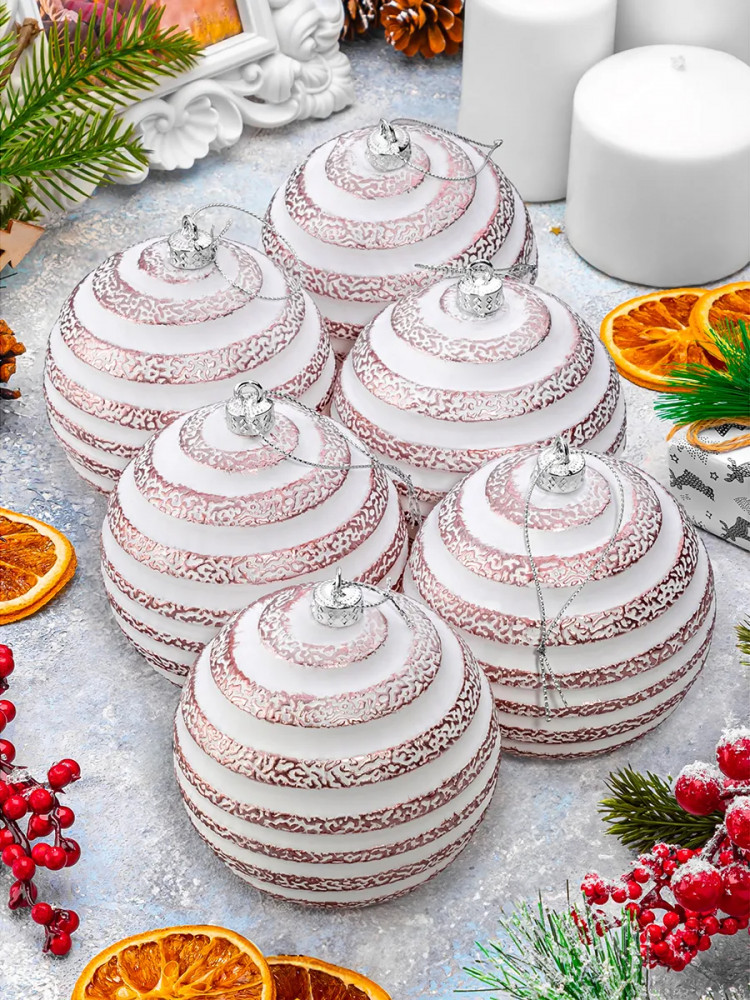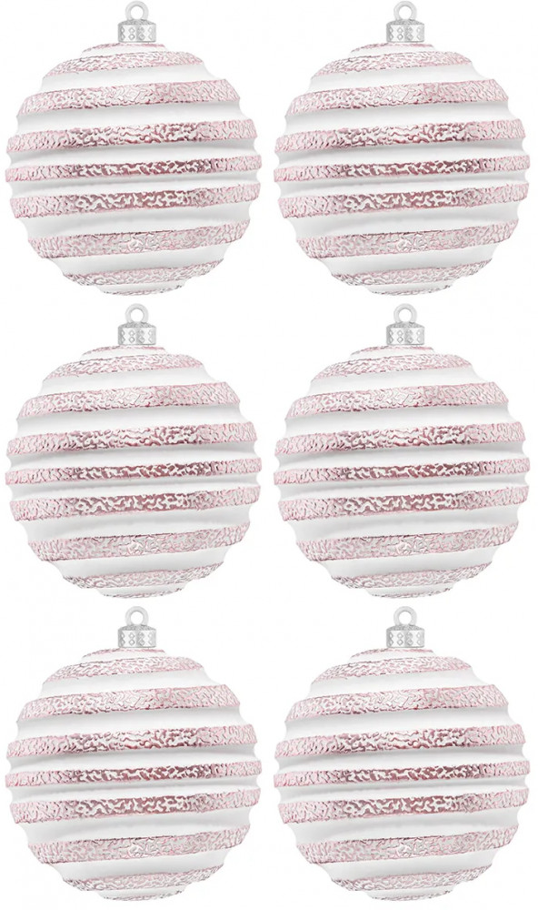 Набор 6 новогодних шаров от бренда Elan Gallery «Белый с розовым» с эффектом старины украсит вашу ёлочку и создаст праздничную атмосферу для взрослых и детей! Выполнены из полиуретана. Изделия из этого материала славятся своей лёгкостью. Диаметр каждого шара — 9,5 см. Имеют оригинальный дизайн в стиле винтаж с рельефными узорами в виде полосок. Лёгкие подвесные шарики подойдут для использования в роли елочного украшения или интерьерного декора. Винтажные шары можно использовать для создания декоративных композиций и повесить на дверь, окно и живые ёлки во дворе. Каждый шарик имеет удобную петлю для подвешивания на веточку ёлки или стену.