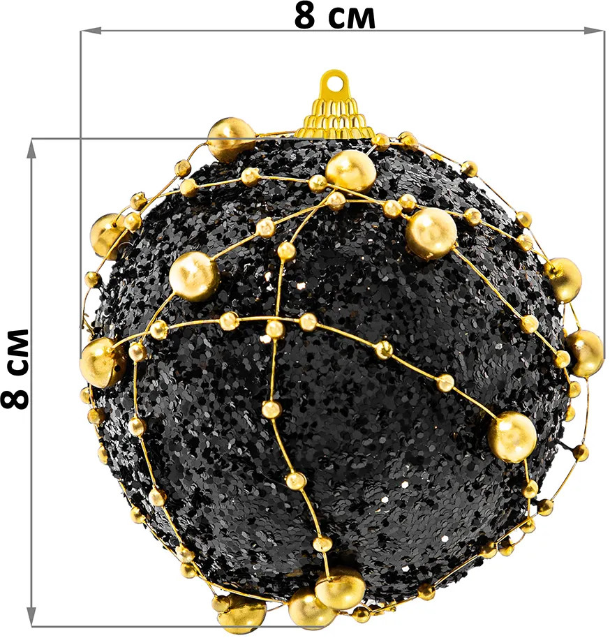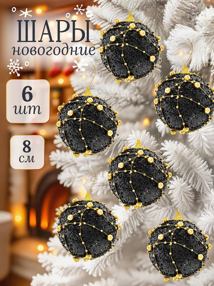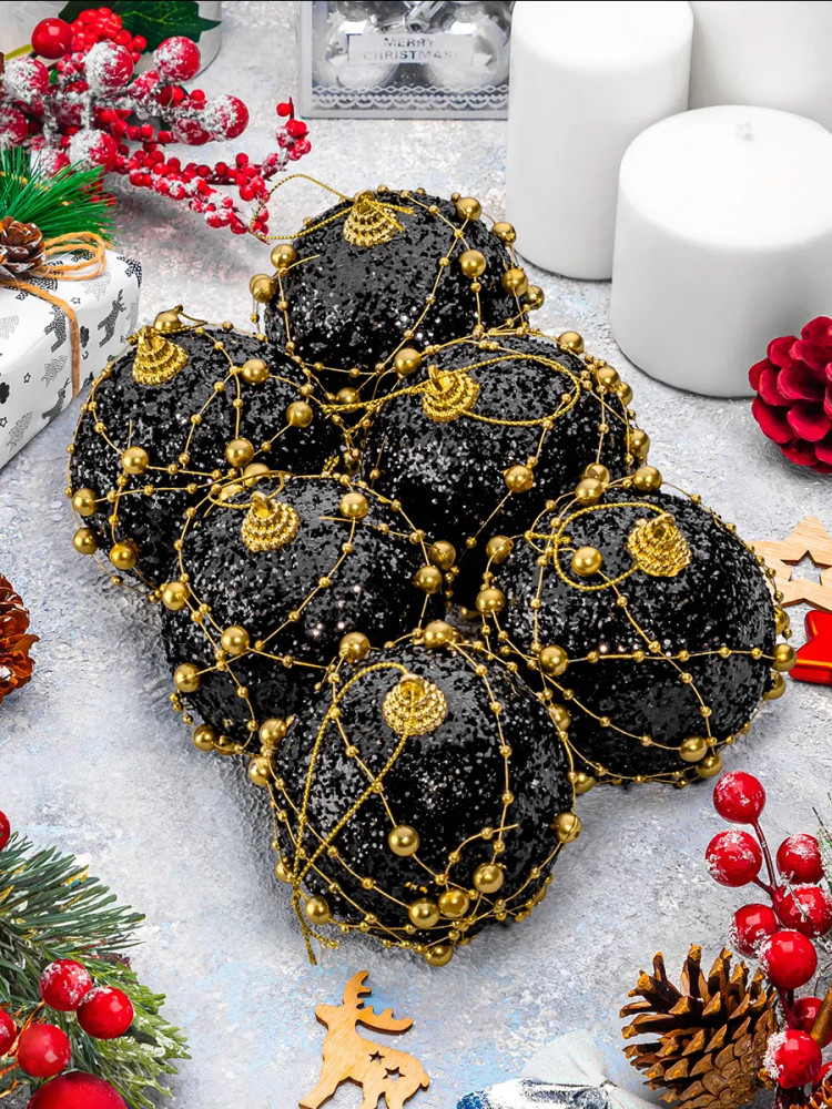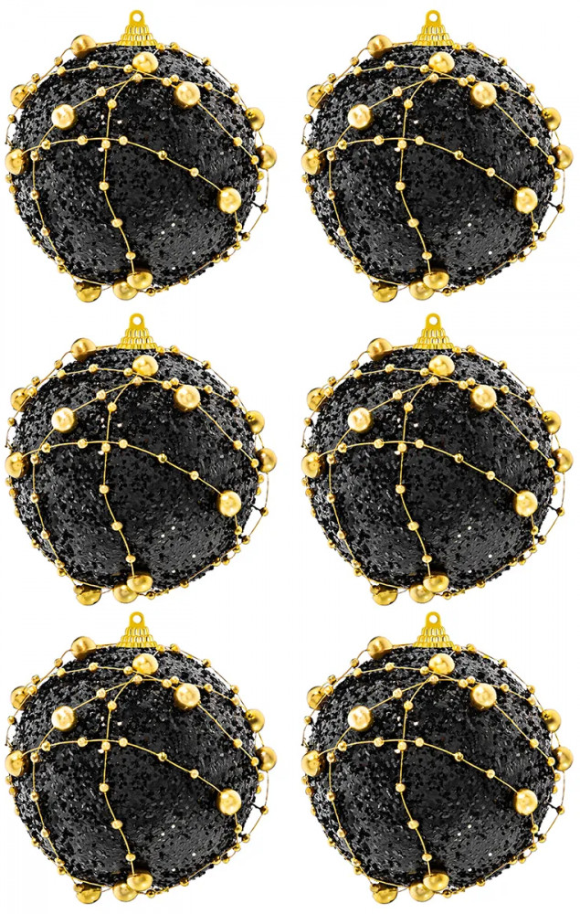 Набор 6 новогодних шаров от бренда Elan Gallery «Чёрный с золотом» украсит вашу ёлочку и создаст праздничную атмосферу для взрослых и детей! Выполнены из пенопласта. Шары украшены глиттером и пластиковыми бусинами золотого цвета. Диаметр каждого блестящего шара — 8 см. Подвесные шарики с золотистыми бусинками подойдут для использования в роли елочного украшения или интерьерного декора. Шары можно использовать для создания декоративных композиций и повесить на дверь, окно и живые ёлки во дворе. Каждый шарик имеет удобную петлю для подвешивания на веточку ёлки или стену.