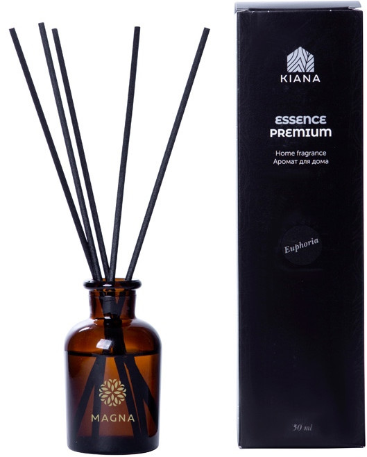 Euphoria — часть серии Essence Premium, премиальной линейки Kiana, которая объединяет ароматы для дома повышенной концентрации. Это умиротворяющий аромат мяты и цитрусов, переплетающийся с древесными и пряными нотами. Объём диффузора 50 мл. Его будет достаточно для умеренного поддержания аромата в комнате до 15м2 в течение двух месяцев использования. Насыщенность аромата регулируется количеством используемых фибровых палочек.