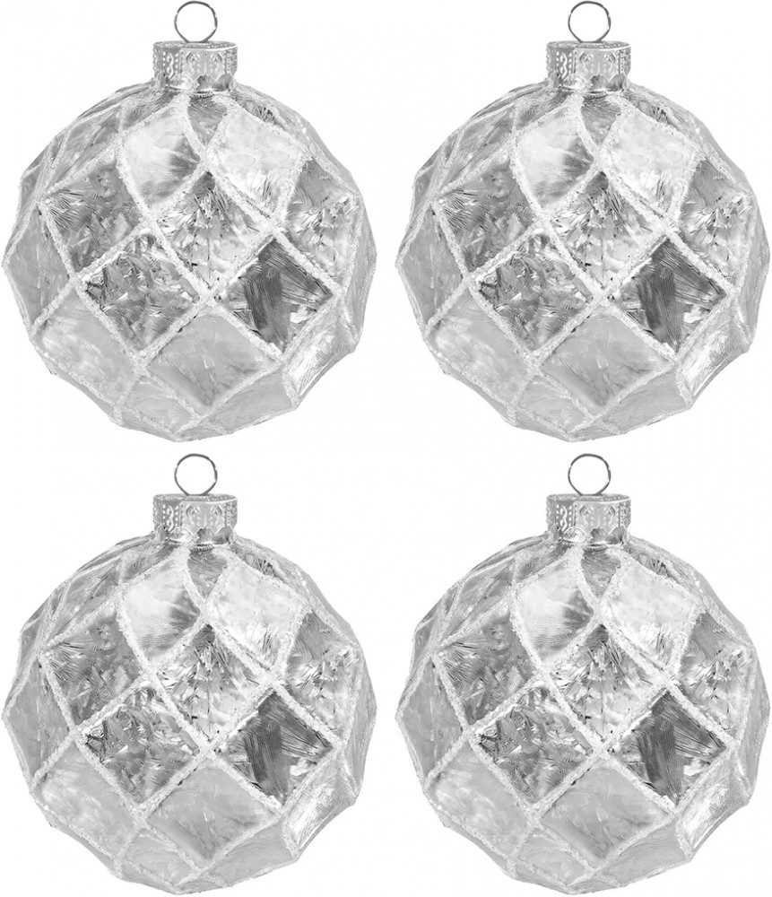 Набор 4 новогодних шаров «Грани» серебряного цвета от бренда Elan Gallery украсит вашу ёлочку и создаст праздничную атмосферу для взрослых и детей! Выполнены из стекла. Диаметр каждого шара — 7,5 см. Стеклянные игрушки украшены рельефным узором в форме ромбиков. Подвесные шарики подойдут в роли елочного украшения или интерьерного декора. Шары с ромбами можно использовать для создания декоративных композиций и повесить на дверь, окно и живые ёлки во дворе. Каждый шарик имеет удобную петлю для подвешивания на веточку ёлки или стену.