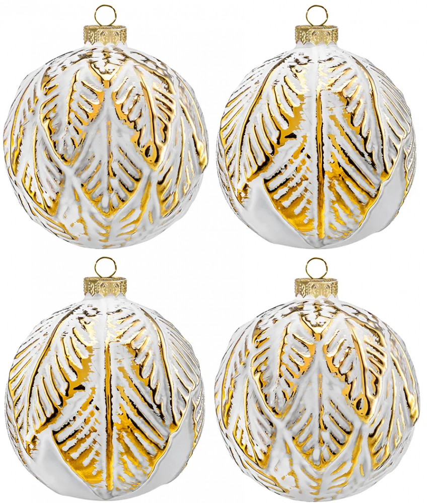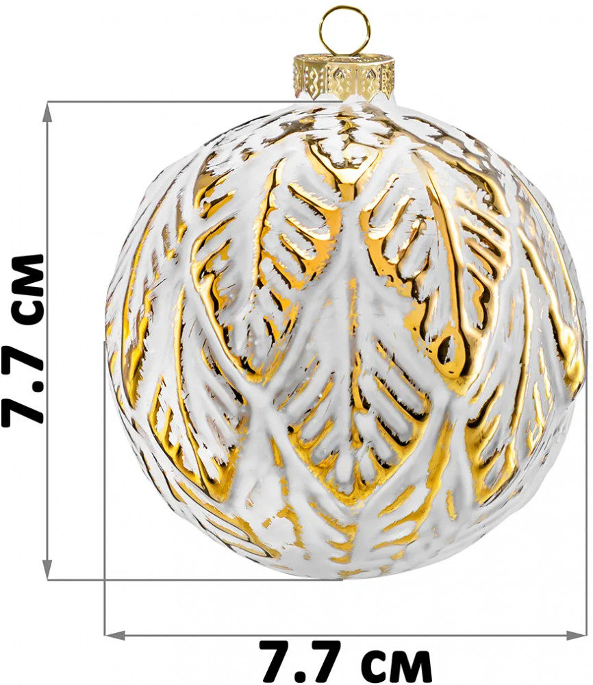 Набор 4 новогодних шаров белого цвета от бренда Elan Gallery с эффектом старины украсит вашу ёлочку и создаст праздничную атмосферу для взрослых и детей! Выполнены из стекла. Диаметр каждого шара — 7,7 см. Имеют оригинальный дизайн в стиле винтаж с золотыми рельефными узорами. Подвесные шарики подойдут для использования в роли елочного украшения или интерьерного декора. Винтажные шары с золотистым рисунком можно использовать для создания декоративных композиций и повесить на дверь, окно и живые ёлки во дворе. Каждый шарик имеет удобную петлю для подвешивания на веточку ёлки или стену.
