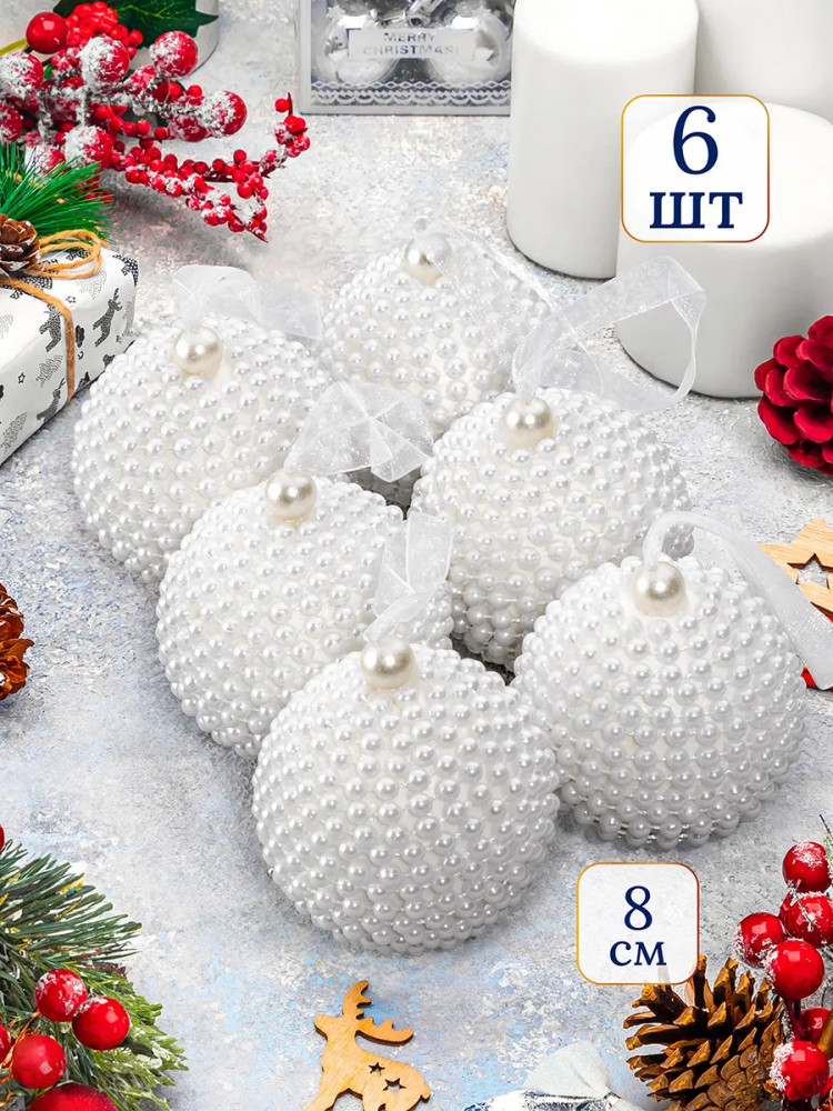 Набор 6 новогодних шаров от бренда Elan Gallery «Белый с жемчужинами» украсит вашу ёлочку и создаст праздничную атмосферу для взрослых и детей! Игрушки выполнены из пенопласта. Изделия из этого материала славятся своей лёгкостью. Элементы, имитирующие жемчужины, выполнены из пластика. Диаметр каждого шара — 8 см. Лёгкие подвесные шарики с бусинами подойдут для использования в роли елочного украшения или интерьерного декора. Шары можно использовать для создания декоративных композиций и повесить на дверь, окно и живые ёлки во дворе. Каждый шарик с бусинками имеет удобную петлю для подвешивания на веточку ёлки или стену.