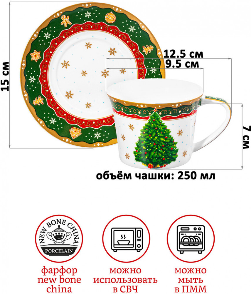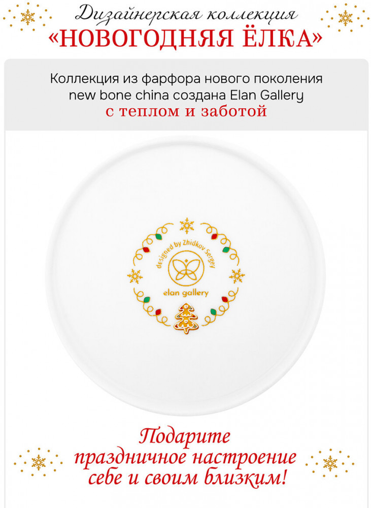Подойдёт ценителям чая и кофе, которые любят пить из красивой и необычной посуды. Согрейтесь зимой любимым напитком: какао с маршмэллоу, ягодным чаем, горячим шоколадом или глинтвейном. Летом освежитесь домашним лимонадом или морсом. Используйте сервировочное блюдце как подставку для чашки, порадовав гостей изящной сервировкой. Положите на десертную тарелку пирожное, кусочек торта или домашнего пирога. Подойдёт не только для десертов, но и для закусок: сырной нарезки, сырокопчёной колбасы или свежих овощей и зелени. Не рекомендуется применять абразивные моющие средства. Подходят для использования в посудомоечной машине и микроволновой печи. Поставляются в дизайнерской картонной коробке — благодаря ей вам не потребуется дополнительная подарочная упаковка. Фарфоровая коллекция посуды «Новогодняя ёлка» от бренда Элан Галерея создаст в доме атмосферу волшебства и подарит праздничное настроение. В серии вы найдёте всё необходимое, чтобы встретить праздник в тёплом семейном кругу. Эта коллекция посуды станет приятным подарком вашим близким на Новый год и будет долго напоминать о вашей дружбе!