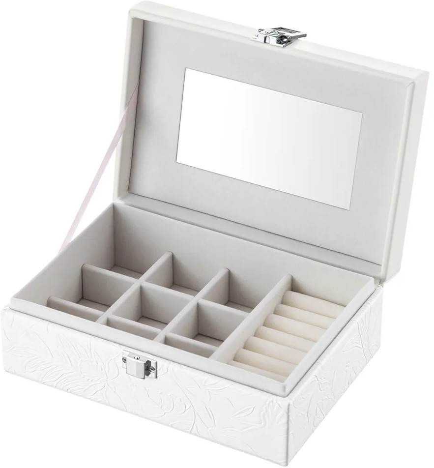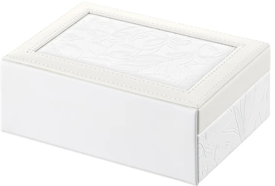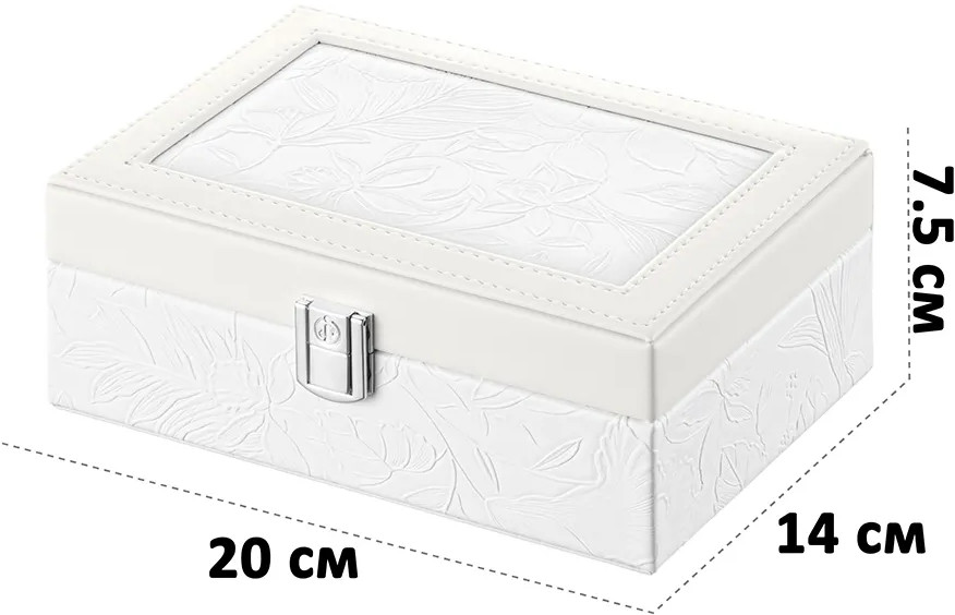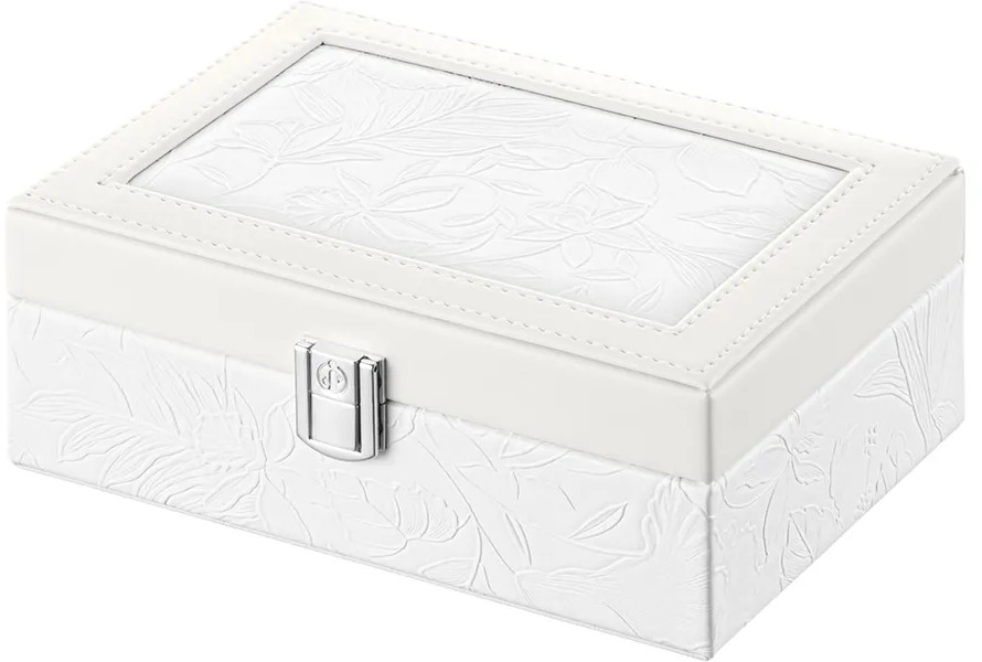 Elan Gallery Шкатулка для украшений с зеркаломновинка В данный момент этот товар отсутствует в продаже. Возможно, у нас найдется аналогичный или похожий товар здесь. Шкатулка для украшений от Elan Gallery послужит универсальным органайзером для ювелирных изделий и бижутерии. Общий размер изделия — 20×14×7,5 см. Состоит из 9 съёмных отделений и специального отсека для колец. На внутренней стороне крышки расположено зеркало размером 12,5×6,5 см. Эстетичная коробочка белого цвета украшена рельефным лиственным узором. Она поможет навести порядок даже в богатой коллекции драгоценностей! Прочные разделители помогут сортировать аксессуары удобным для вас способом: по типу изделия, цвету или материалу. Разложите по отсекам браслеты, кулоны, колье или цепочки из золота, серебра и других металлов. Отделение для колец также можно использовать для хранения серёг-колец или серёжек-гвоздиков. Надёжный серебристый замок обеспечит сохранность изделий. |