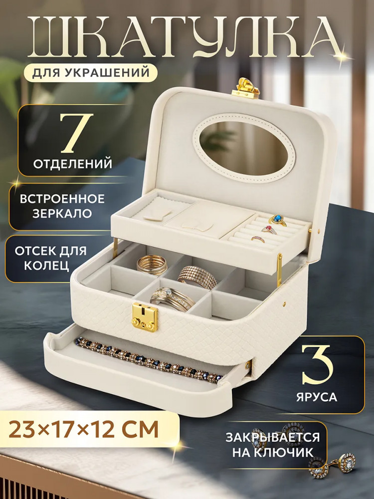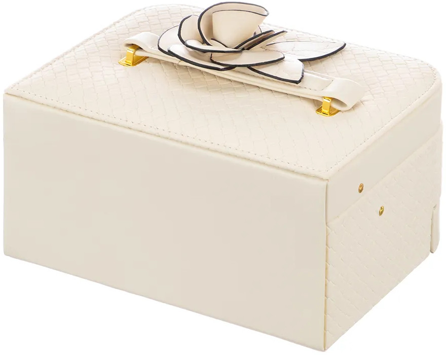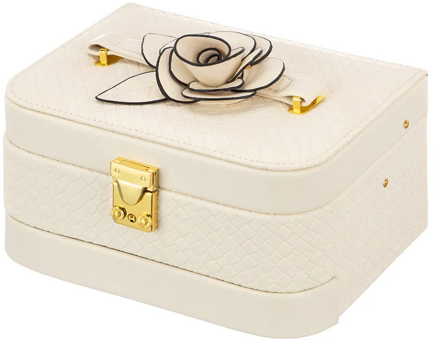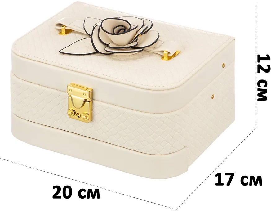 Шкатулка для украшений от Elan Gallery послужит универсальным органайзером для ювелирных изделий и бижутерии. Общий размер изделия — 23×17×12 см. Состоит из 3 ярусов. Верхних ярус на подъёмном механизме состоит из отсека для колец и двух тайников. Средний ярус состоит из шести отделений. Нижний ярус представляет собой выдвижной ящичек свободного назначения. На внутренней стороне крышки расположено овальное зеркало размером 11,5×5,5 см. Эстетичная коробочка белого цвета украшена рельефным узором. Крышка оснащена прочной ручкой для переноски с большим декоративным цветком. Изделие поможет навести порядок даже в богатой коллекции драгоценностей! Прочные разделители помогут сортировать аксессуары удобным для вас способом: по типу изделия, цвету или материалу. Разложите по отсекам браслеты, кулоны, колье или цепочки из золота, серебра и других металлов. Отделение для колец также можно использовать для хранения серёг-колец или серёжек-гвоздиков. Надёжный золотистый замок обеспечит сохранность изделий. Чтобы открыть его, мягко потяните левую «шестерёнку» вправо. |