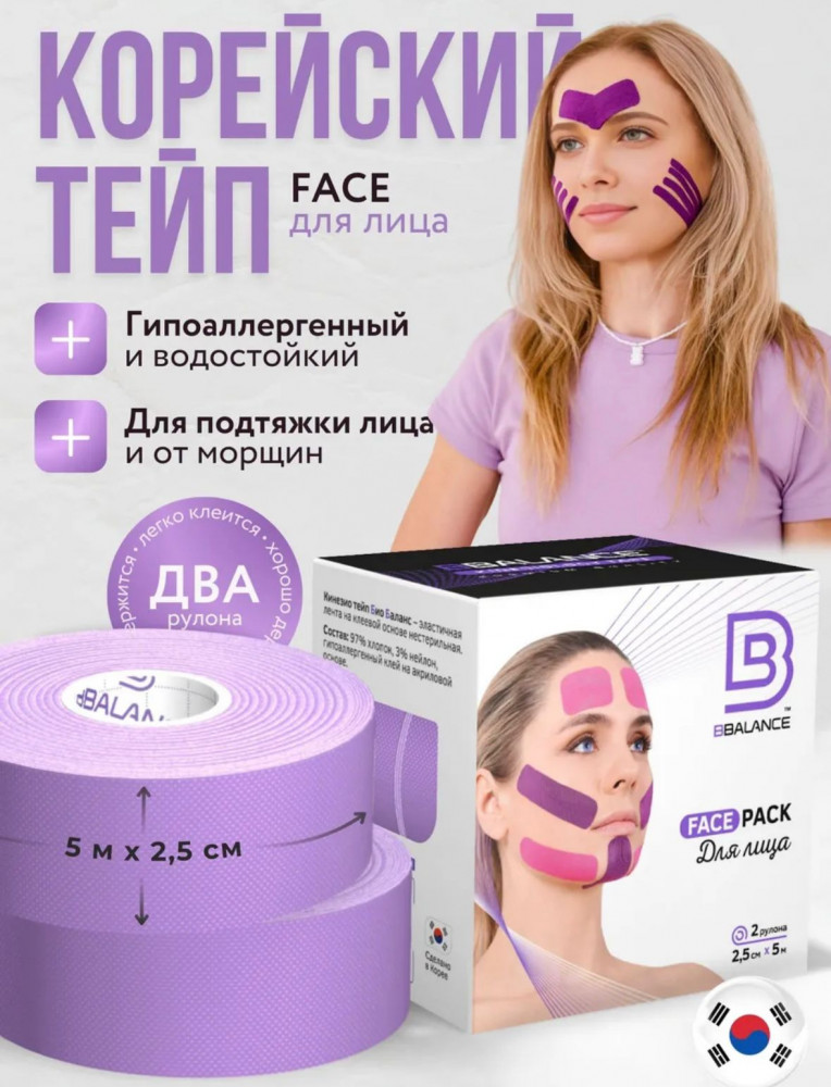 Тейпы для лица, тела и шеи 2,5 см х 5 м хлопковый набор из 2 штук. Состав: 97% хлопок, 3% нейлон. Степень фиксации: мягкая 2. Гипоаллергенный клей на акриловой основе. Растяжимость 140-180%. Тейпирование — это эффективное средство от морщин, для похудения от жира, уменьшения второго подбородка, подтяжки овала лица и живота, от болей в мышцах и суставах. Спортивный тейп используют в лечебных и косметических целях для глаз, пальцев, шеи, носа, ног, груди, век, колена. Тэйп лента создает лимфодренажный и лифтинг эффект, а чтобы усилить лимфодренаж используйте перфорированный тейп Biobalance tape. Дренажный эластичный скотч производится в Корее по самым современным технологиям по производству товаров для кинезиологического тейпирования.