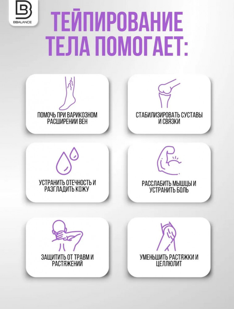 Кинезиотейпинг с bbtape избавит вас от боли спины и коленных суставов. Он является гипоаллергенным и водостойким. Подходит для занятий спортом и фитнесом, для бега, танцев, волейбола, футбола и хоккея. Поможет детям, занимающимся гимнастикой от травм и для мужчин и женщин после операций и родов против растяжек и целлюлита. Биобаланс тейпы можно использовать для зоны декольте и лица от отеков и брылей, подтяжки груди, как футбольный, волейбольный и хоккейный тейп для поддержки голеностопа и локтя, от носогубных складок, от межбровных морщин, мешков, темных кругов и синяков под глазами, коррекции контура лица, губ и рта.