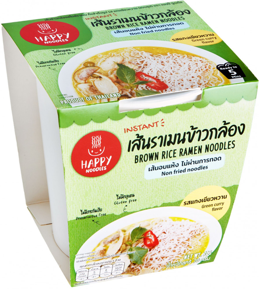 Лапша: бурый рис, белый рис, крахмал тапиоки, картофельный крахмал, кукурузный крахмал, приправа: сахар, соль, специи, дрожжевой экстракт, порошок рыбного соуса, луковый порошок, зеленый лук, сухое кокосовое молоко, пальмовое масло, морковь, кукуруза, горошек, усилитель вкуса: Е621 (глутамат натрия), усилитель вкуса: Е635 (5′-рибонуклеотиды динатрия), антислеживающий агент: Е551 (Диоксид кремния), эмульгаторы: Е471 (моноглицериды и диглицериды жирных кислот), Е322 (соевый лецитин).