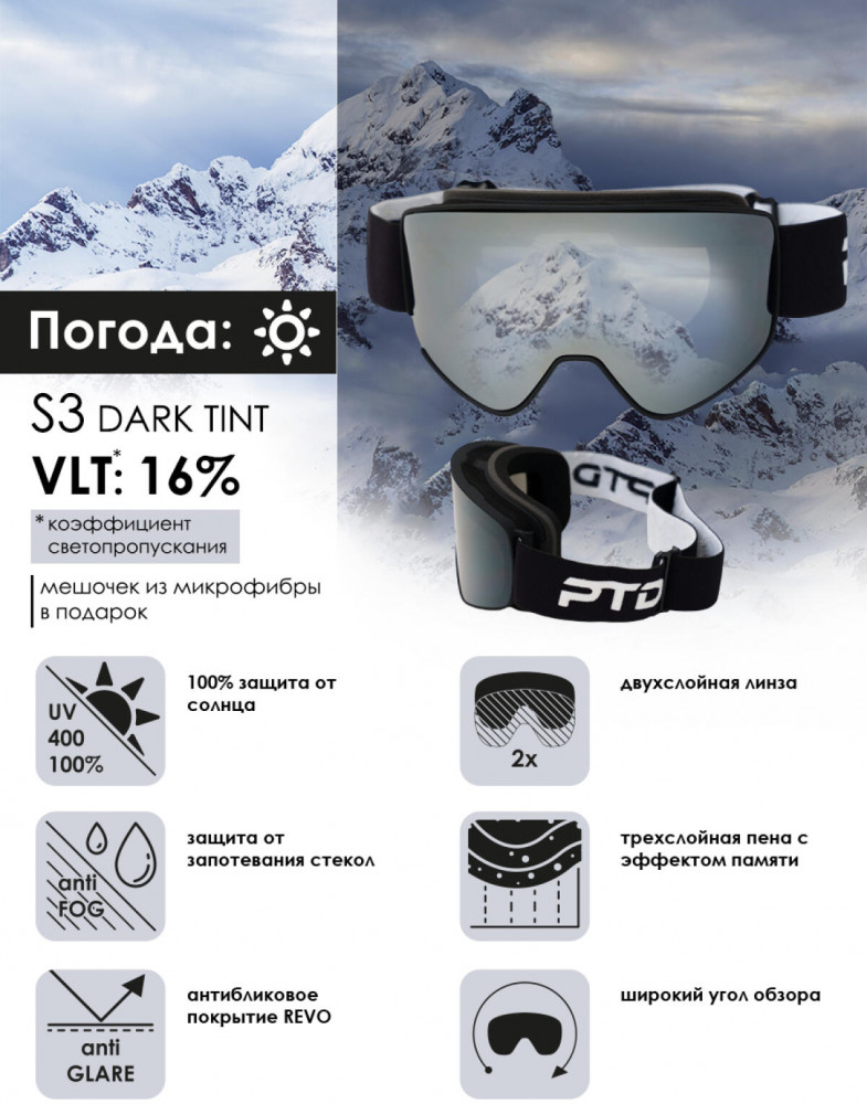 Советы по уходу и использованию: протирай линзы мягкой тканью только с внутренней стороны, не закрывай вентиляционные отверстия., надевай маску на сухое лицо — это предотвратит запотевание, не используй маску за рулем и не смотри в ней на солнце.