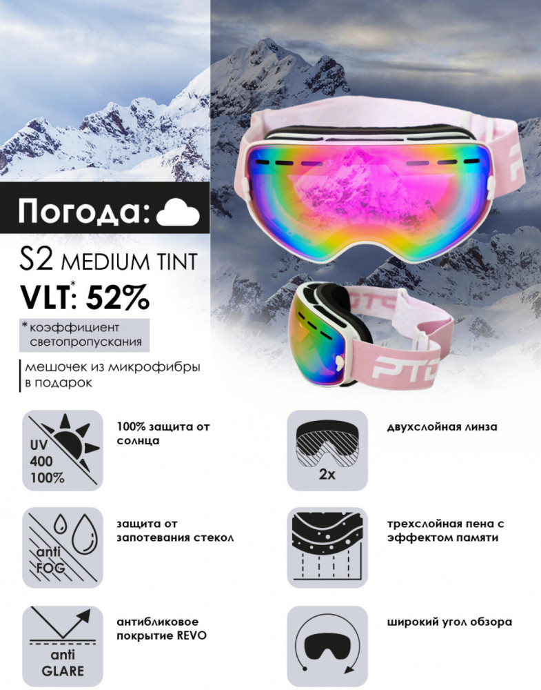 Горнолыжная детская маска для девочки от PlayToday — стиль, безопасность и комфорт на склоне Преимущества модели: двойная линза категории S2 — оптимальный выбор для большинства погодных условий: от облачной до переменной облачности; зеркальное покрытие sakura pink full revo — улучшенная цветопередача и защита от солнечных бликов; anti-fog защита от запотевания — чёткое зрение даже при активном катании; VLT 52% и SPF 18–43% — эффективная светопропускная способность и защита глаз от ультрафиолета (100% UV); анатомическая посадка: 3 слоя мягкого пенного уплотнителя обеспечивают комфортное прилегание к лицу без давления; универсальный размер 159.6×79.8 мм — подходит детям от 7 до 14 лет; регулируемый ремешок с антискользящим силиконовым слоем — совместим с любыми шлемами, не сползает во время движения.
