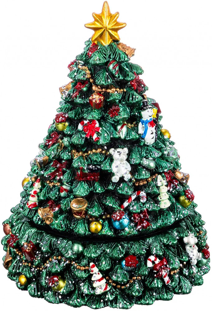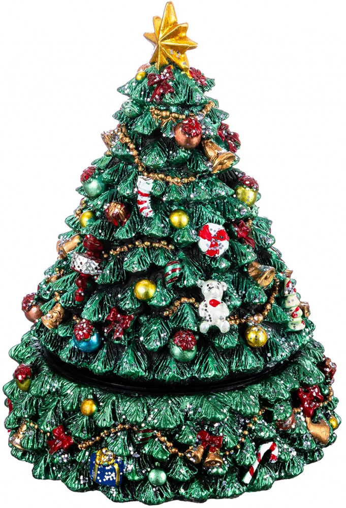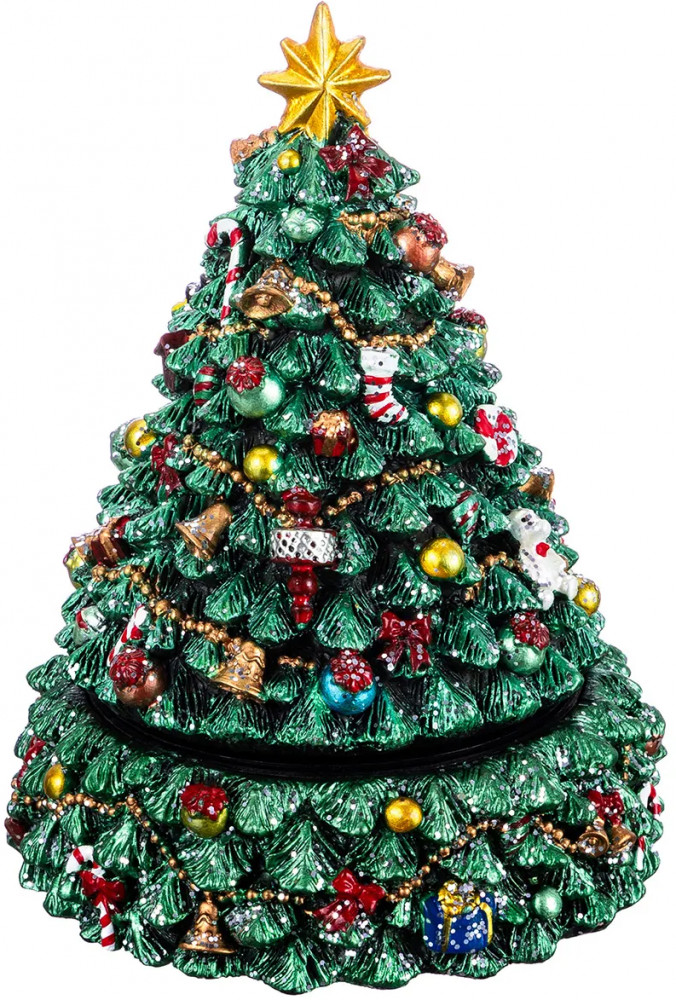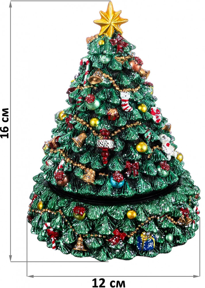 Музыкальная карусель «Рождественская ель» от Elan Gallery — это маленькое путешествие в дивный мир зимней сказки. Её размер — 12×12×16 см. Выполнена из полистоуна — современного материала, который славится своей прочностью, износостойкостью и устойчивостью к перепадам температур. Он не подвержен деформации и не выделяет вредных веществ. Полистоун легко поддаётся обработке, поэтому изделия из него отличаются высокой детализацией. На красивой зелёной ёлке развешаны новогодние украшения: шары, конфеты и другие символы праздника. Поверхность присыпана блёстками, напоминающими снежинки. Верхушку венчает большая золотая звезда. Основание оснащено мягким противоскользящим покрытием. |