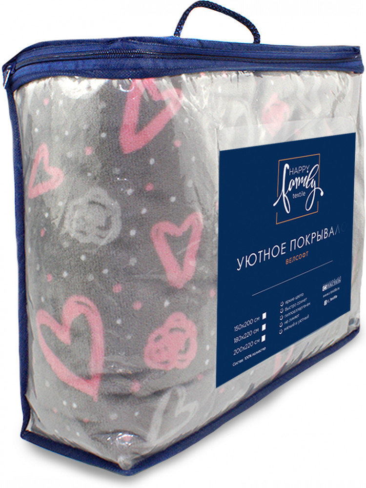 Покрывало ТМ «Happy Family» выполнен из материала велсофт, очень мягкий и приятный на ощупь. Велсофт отлично сохраняет тепло и не отводит его от тела, плед достаточно легкий и не толстый, но при этом очень теплый, может использоваться в качестве осеннего, зимнего или весеннего. А в теплую погоду заменит легкое одеяло, флисовое, стеганное или вязаное покрывало. Декоративное покрывало отлично впишется в дизайн любой комнаты и украсит интерьер.