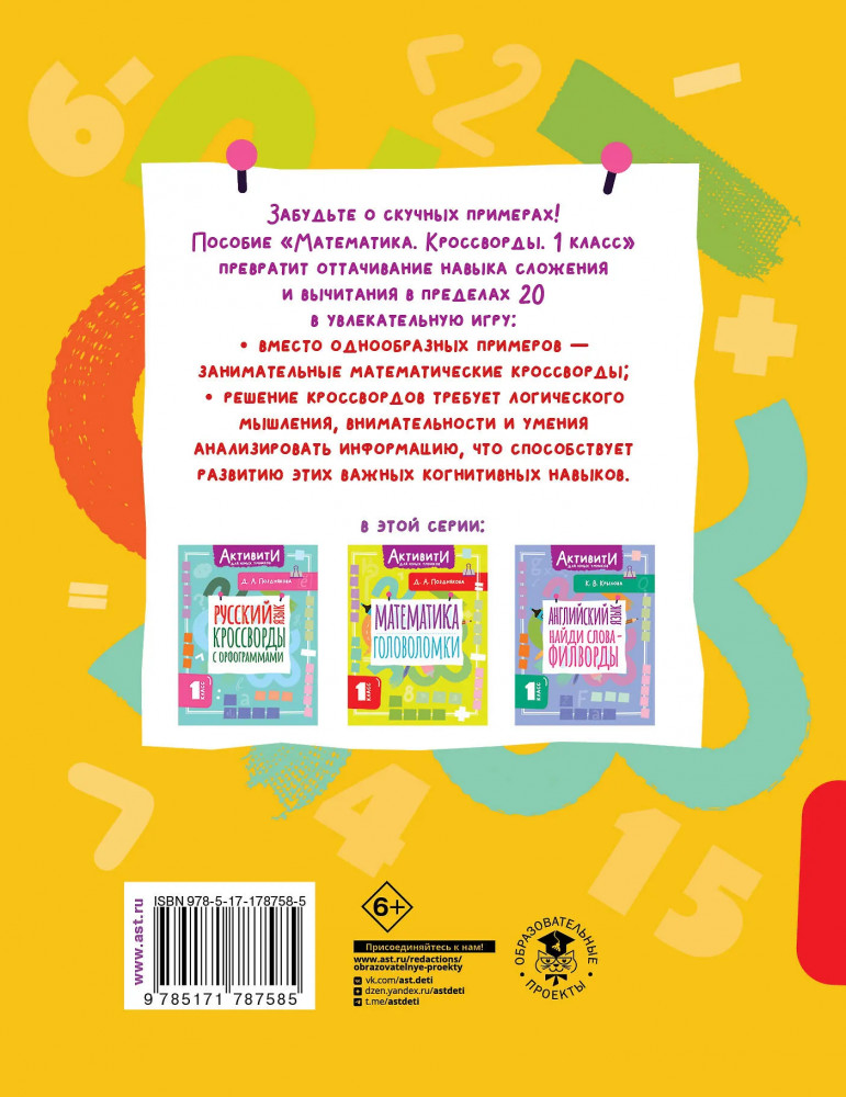 Серия: Активити для юных умников Превратите изучение математики в увлекательное приключение с пособием «Математика. Кроссворды. 1 класс»! Это пособие предлагает юным математикам необычный способ освоения сложения и вычитания в пределах 20 — разгадывать кроссворды! |