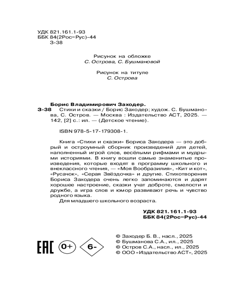 Серия: Детское чтение Книга «Стихи и сказки» Бориса Заходера — это добрый и остроумный сборник произведений для детей, наполненный игрой слов, весёлыми рифмами и мудрыми историями. В книгу вошли самые знаменитые произведения, которые входят в программу школьного и внеклассного чтения, — «Моя Вообразилия», «Кит и кот», «Русачок», «Серая Звёздочка» и другие. Стихотворения Бориса Заходера очень легко запоминаются и дарят хорошее настроение, сказки учат доброте, смелости и дружбе, а игра слов и юмор развивают речь и чувство родного языка. |