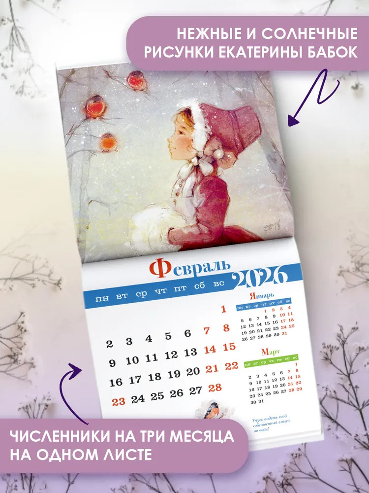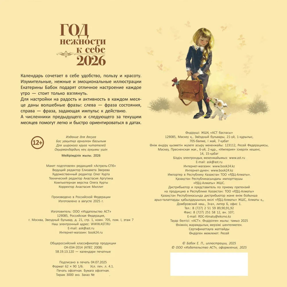 Серия: Календарь детский 2026 год Настенный календарь для настройки счастливого года. Этот атмосферный и полезный настенный календарь задаст атмосферу на целый год! Пусть эти 12 месяцев месяцами станут годом заботы о себе, уважения к себе, нежности к себе. Трепетные, теплые и милые рисунки Екатерины Бабок на каждом развороте календаря будут приносить вам наслаждение при каждом взгляде на них. |