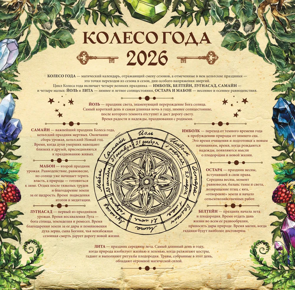 Серия: Календарь настенный на 2026 год Красочный настенный календарь для всех, кому по душе эстетика современных ведьм, повседневной магии и мистической силы природы. В каждом месяце вы найдете: ритуал, рецепт волшебного блюда или напитка, информацию об эфирных маслах, свечах и атрибутах месяца. В календарной сетке отмечены главные лунные фазы, названия полнолуний и праздники из Колеса года. |