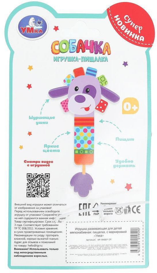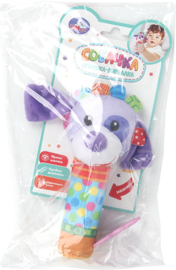 Текстильная игрушка-погремушка с пищалкой «Собачка» ТМ «УМка» разработана специально для самых маленьких. Эта игрушка в виде забавного пёсика выполнена из очень мягкого и гипоаллергенного материала красочной расцветки. При нажатии игрушка издаёт забавный пищащий звук, а если её потрясти — весело загремят шарики, надежно спрятанные внутри. Прорезыватель интересной формы из качественного безопасного материала пригодится малышу, когда у него будут резаться зубки.