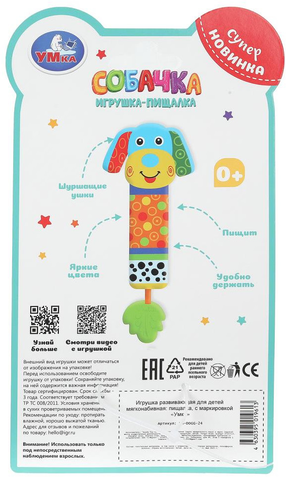 Текстильная игрушка-погремушка с пищалкой «Собачка» ТМ «УМка» разработана специально для самых маленьких. Эта игрушка в виде забавного пёсика выполнена из очень мягкого и гипоаллергенного материала красочной расцветки. При нажатии игрушка издаёт забавный пищащий звук, а если её потрясти — весело загремят шарики, надежно спрятанные внутри. Прорезыватель интересной формы из качественного безопасного материала пригодится малышу, когда у него будут резаться зубки. |