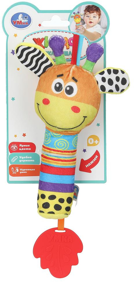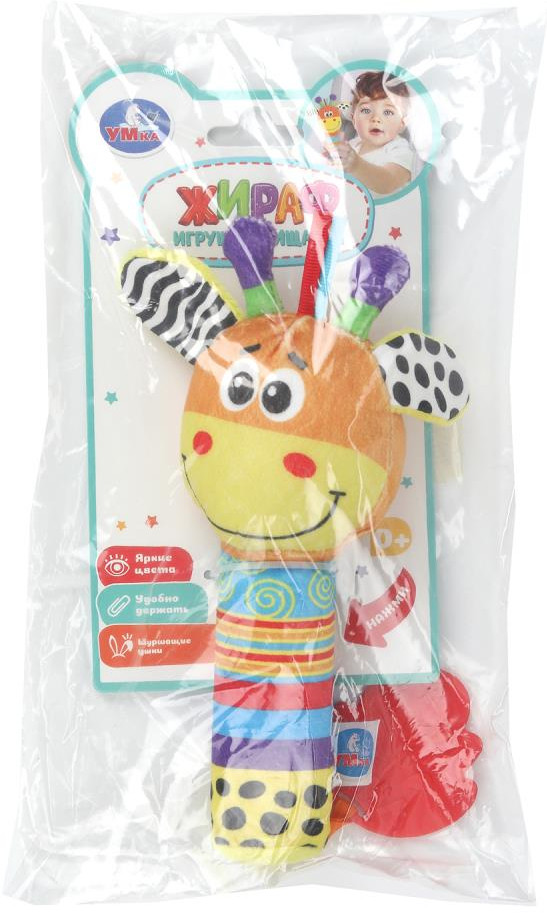 Текстильная игрушка-погремушка с пищалкой «Жираф» ТМ «УМка» разработана специально для самых маленьких. Эта игрушка в виде забавного жирафика выполнена из очень мягкого и гипоаллергенного материала красочной расцветки. При нажатии игрушка издаёт забавный пищащий звук, а если её потрясти — весело загремят шарики, надежно спрятанные внутри. Прорезыватель интересной формы из качественного безопасного материала пригодится малышу, когда у него будут резаться зубки.
