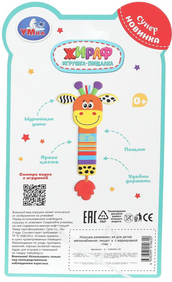УМка Игрушка-погремушка с пищалкой «Жираф»