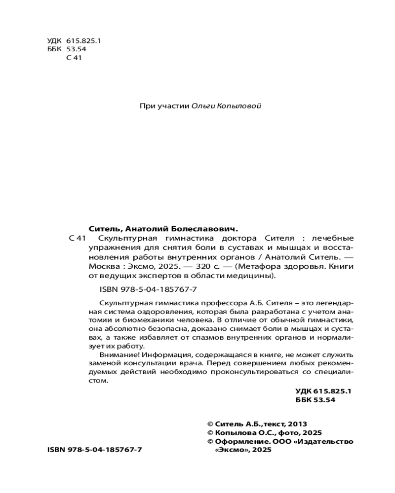 Серия: Метафора здоровья. Книги от ведущих экспертов в области медицины Скульптурная гимнастика доктора Сителя — это легендарная система оздоровления, которая была разработана с учетом анатомии и биомеханики человека. Она безопасна для людей с нарушениями осанки и заболеваниями суставов. При этом отличается удивительной доступностью: никакой специальной подготовки или оборудования не требуется — заниматься можно прямо у себя дома. |