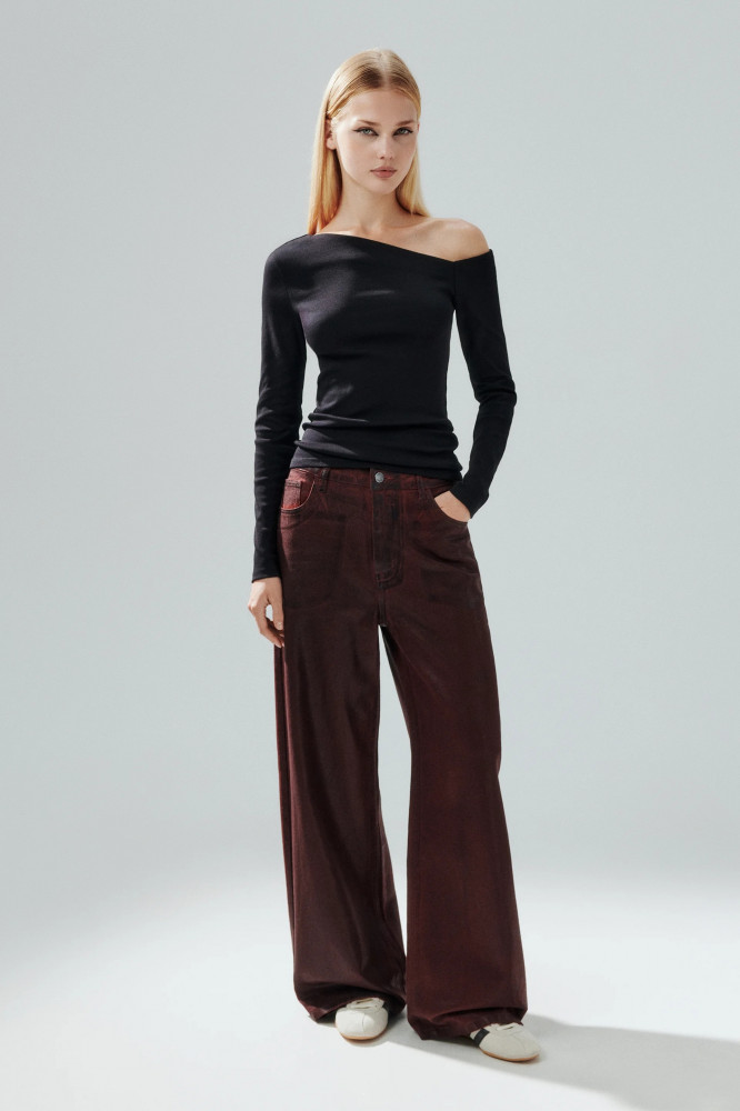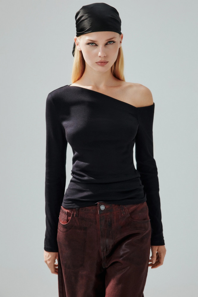 Женский лонгслив приталенного кроя из мягкой и дышащей хлопковой ткани. Широкий вырез горловины off-shoulders с открытым плечом. Длинные облегающие рукава с прямыми манжетами и прямой линией плеча. Прямой нижний край без разрезов. Тонкий однотонный лонгслив на одно плечо для самых стильных и привлекательных аутфитов на каждый день или по особым случаям. Сочетай его с объемным низом, чтобы чувствовать себя расслабленно и комфортно.