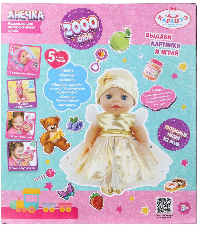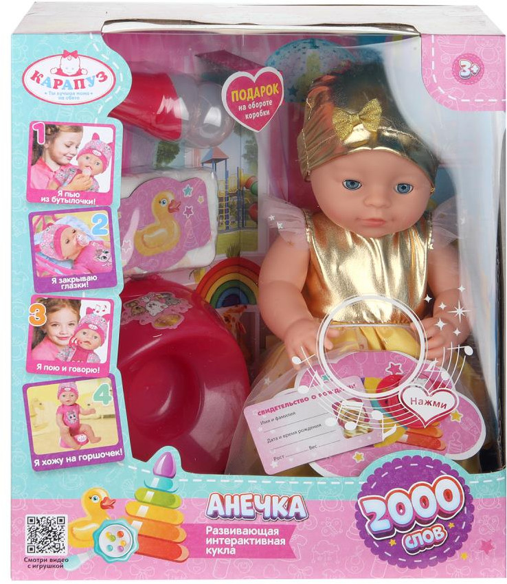 Озвученный пупс «Анечка» ТМ «Карапуз» станет прекрасным подарком для девочки. Этот милый пупс обязательно понравится вашей малышке. Анечка одета в золотистое платьице, на голове — шапочка в тон. Одежда легко надевается и снимается. С такой куколкой девочка может играть в самые разные игры, гулять с ней, петь песни, кормить, переодевать, рассказывать сказки и укладывать спать. Игра с интерактивным пупсом ТМ «Карапуз» учит ребёнка заботиться об окружающих, быть ответственным и внимательным, а также развивает: воображение, память, внимание, звуковое восприятие и музыкальный слух и социально-коммуникативные навыки.