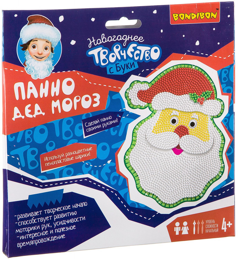 Новогодний, увлекательный набор для детского творчества! Ваш ребенок с огромным удовольствием сделает панно с Дедом Морозом из разнообразных ярких деталей и цветных, пенопластовых шариков.