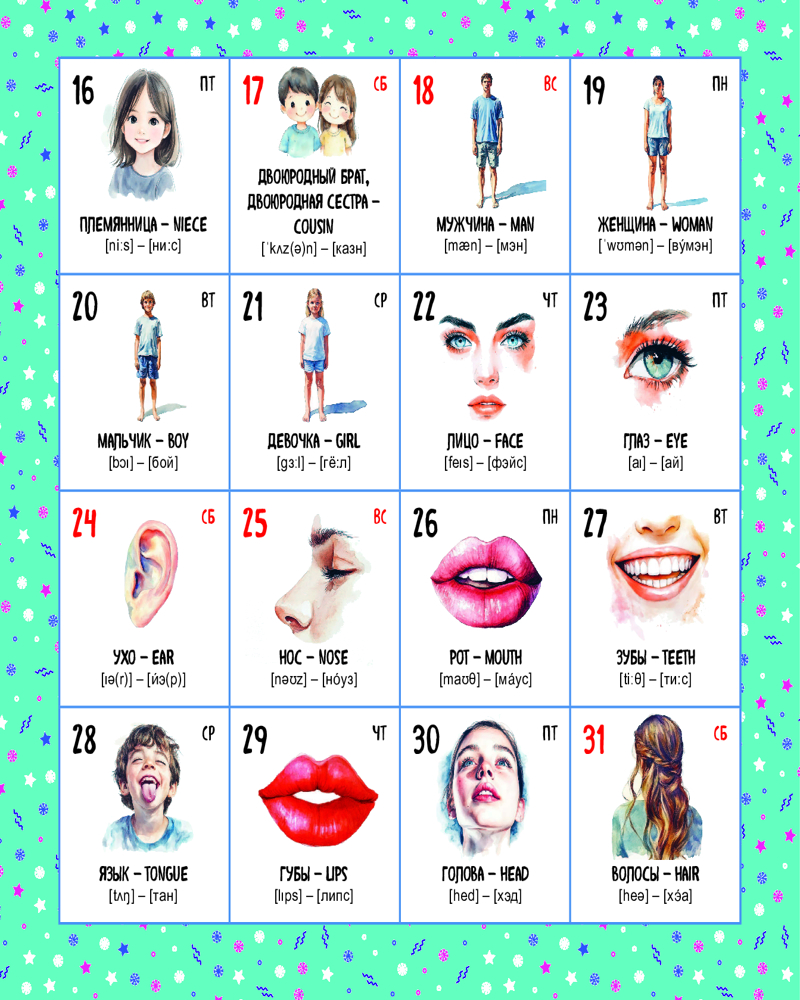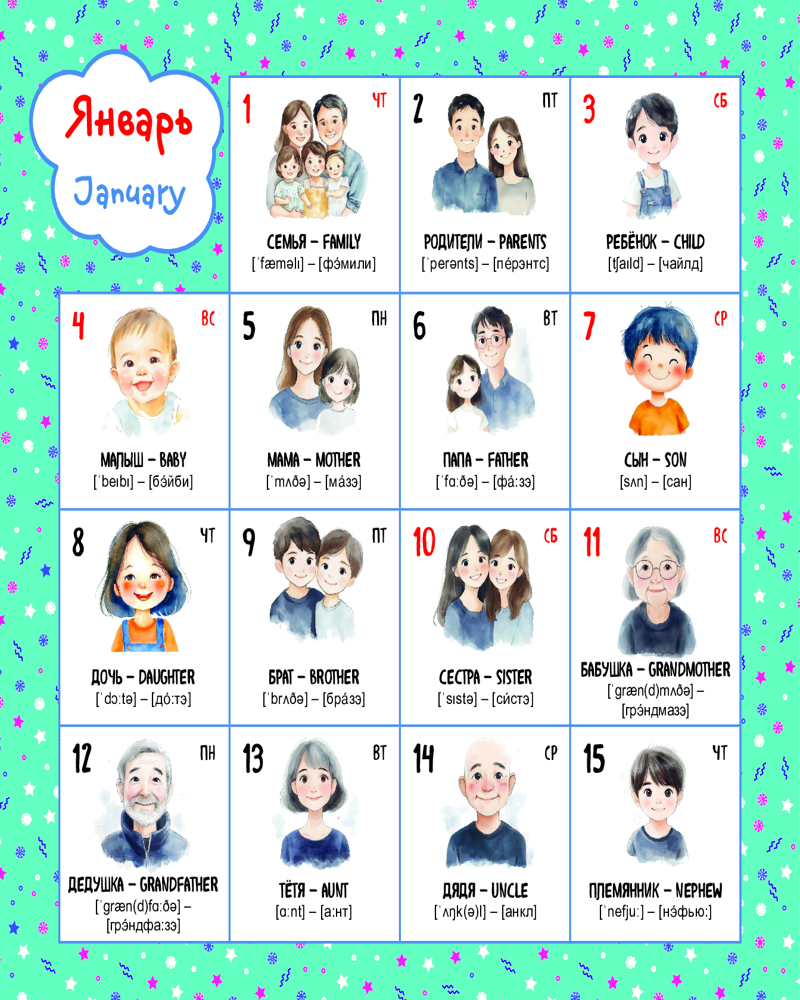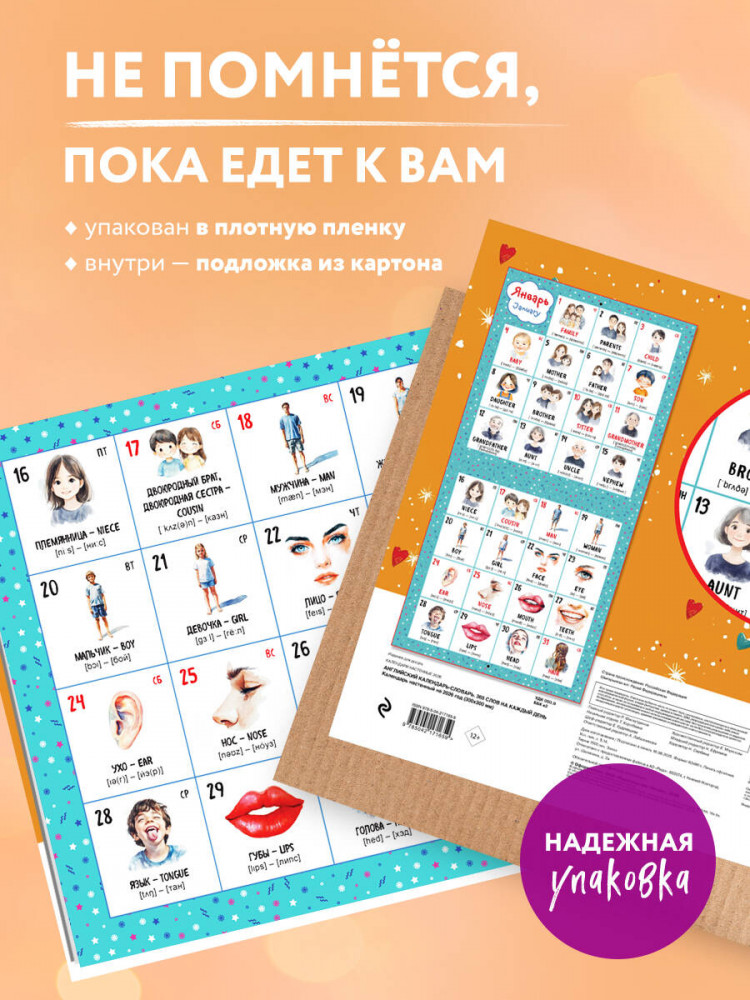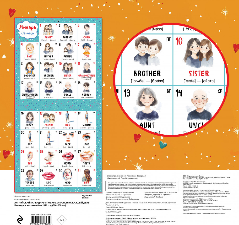 Серия: Календари настенные 2026 (300×300) Пусть 2026 год станет годом открытий! Перед вами не просто календарь, а красочный мост в мир английского языка! 365 слов — по одному на каждый день, с яркими иллюстрациями, чтобы образ закреплялся в памяти легко и естественно. Этот календарь поможет вашему ребенку плавно и с интересом погружаться в мир английского языка — день за днем, слово за словом. Без зубрежки и скуки. А с помощью красочных иллюстраций ребенок будет легко запоминать английские слова. |