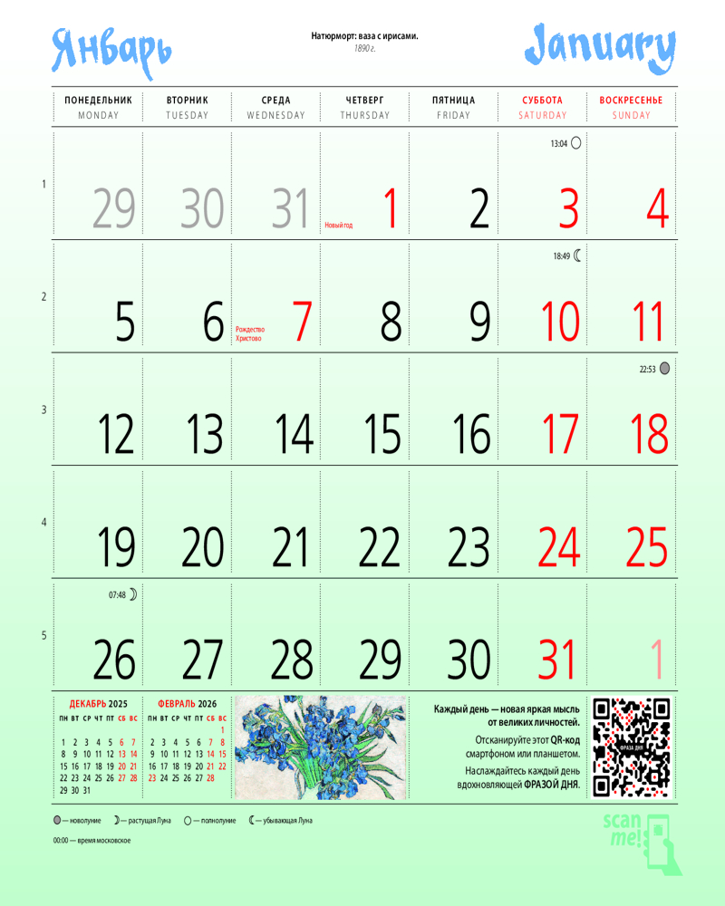 Серия: Календари настенные 2026 (300×300) Практичный и эстетичный, этот календарь каждый месяц будет радовать вас. Прекрасные картины органично дополнят любой интерьер и помогут планировать время. В этом календаре представлены шедевры кисти Винсента Ван Гога. |