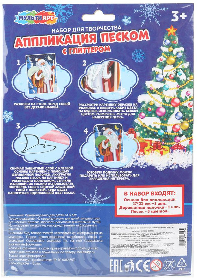 Набор для творчества — аппликация из песка с глиттером «Новый год. Дед Мороз» ТМ «Мульти Арт» — отличный подарок для ребёнка, который будет способствовать развитию его творческих способностей. С помощью красочной основы и разноцветного матового песка с глиттером маленький художник сможет самостоятельно создать аппликацию с изображением Деда Мороза. Готовую поделку можно подарить близким или использовать для украшения интерьера. |
