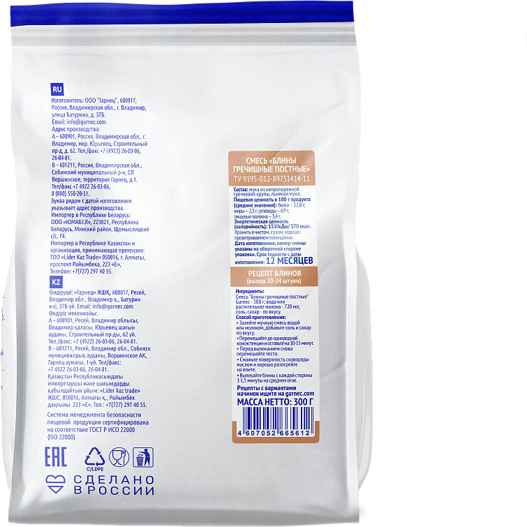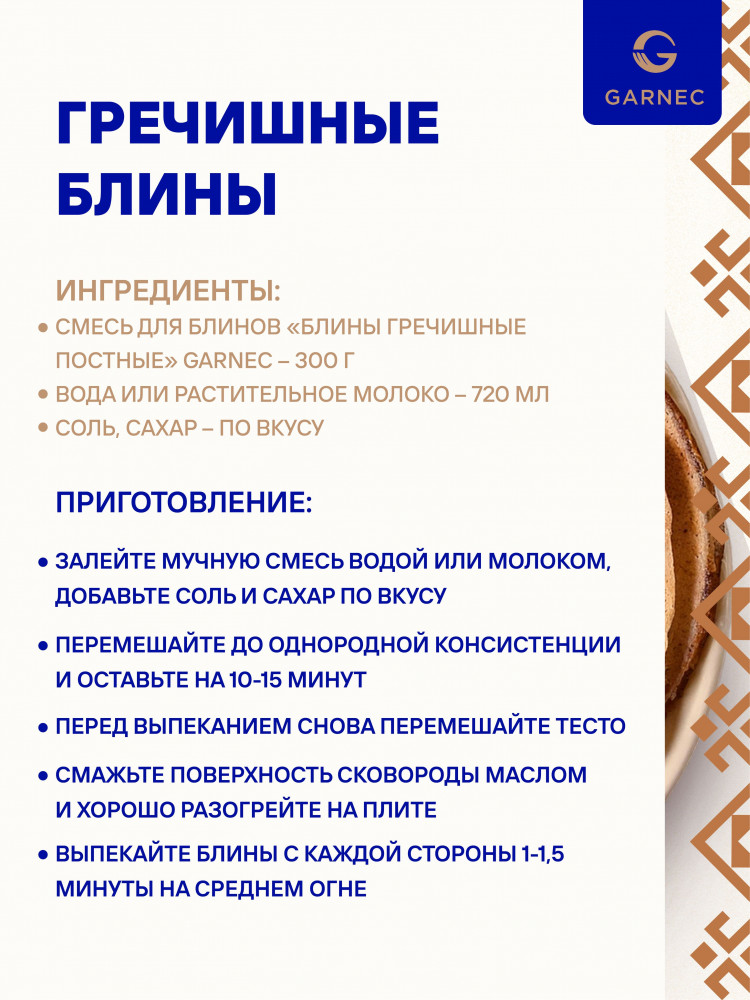 Представляем вашему вниманию смесь для блинов от торговой марки Гарнец — «Блины гречишные постные». Этот продукт станет настоящей находкой для тех, кто предпочитает здоровое питание, придерживается поста и следит за своим рационом. Смесь «Блины гречишные постные» будет особенно интересна вегетарианцам, людям, соблюдающим пост, а также всем, кто стремится к сбалансированному питанию без ущерба вкусу.