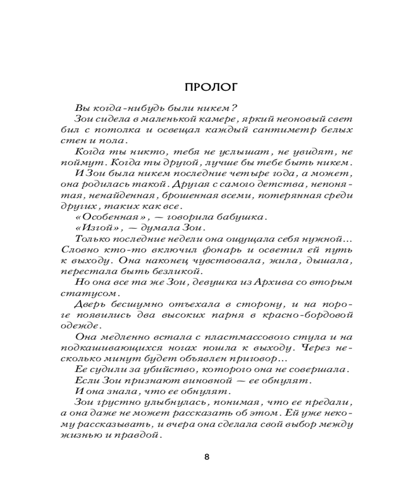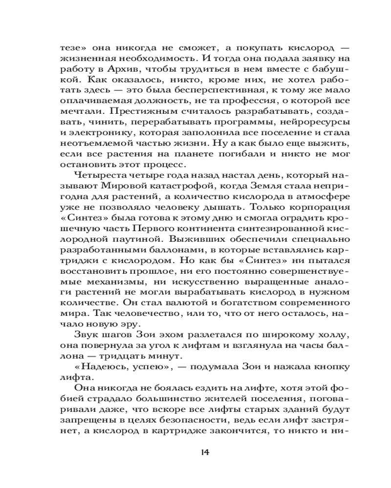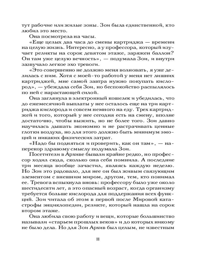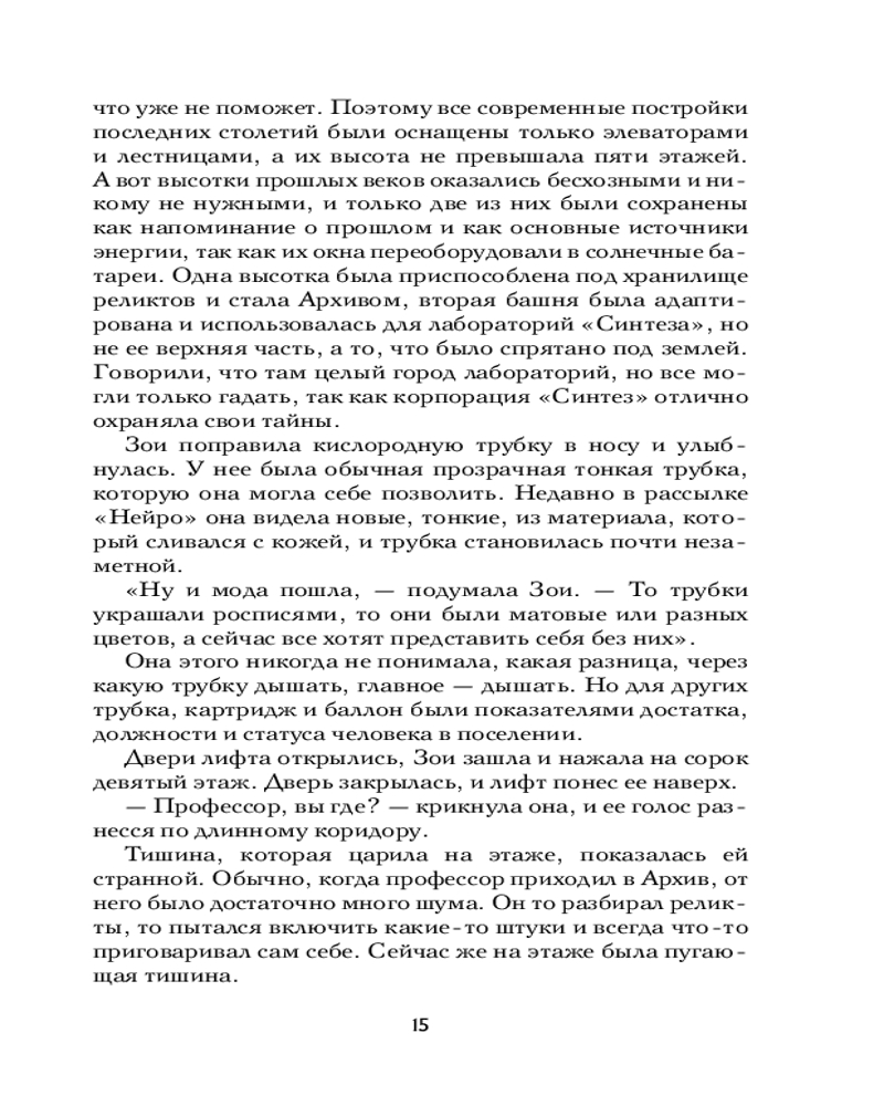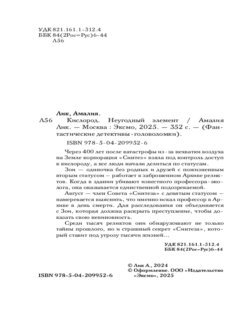 Серия: Фантастические детективы-головоломки Через 400 лет после катастрофы из-за нехватки воздуха на Земле корпорация «Синтез» взяла под контроль доступ к кислороду, а все люди начали делиться по статусам. Зои, одиночка без родных и друзей с пожизненным вторым статусом, работает в заброшенном Архиве реликтов. Когда в здании убивают известного профессора-эколога, она оказывается единственной подозреваемой. Август — член Совета «Синтеза» с девятым статусом — намеревается выяснить, что именно искал профессор в Архиве в день смерти. Для расследования он объединяется с Зои, которая должна раскрыть преступление, чтобы доказать свою невиновность. Среди тысяч реликтов они обнаруживают не только тайны прошлого, но и страшный секрет «Синтеза», который ставит под угрозу тысячи жизней... |