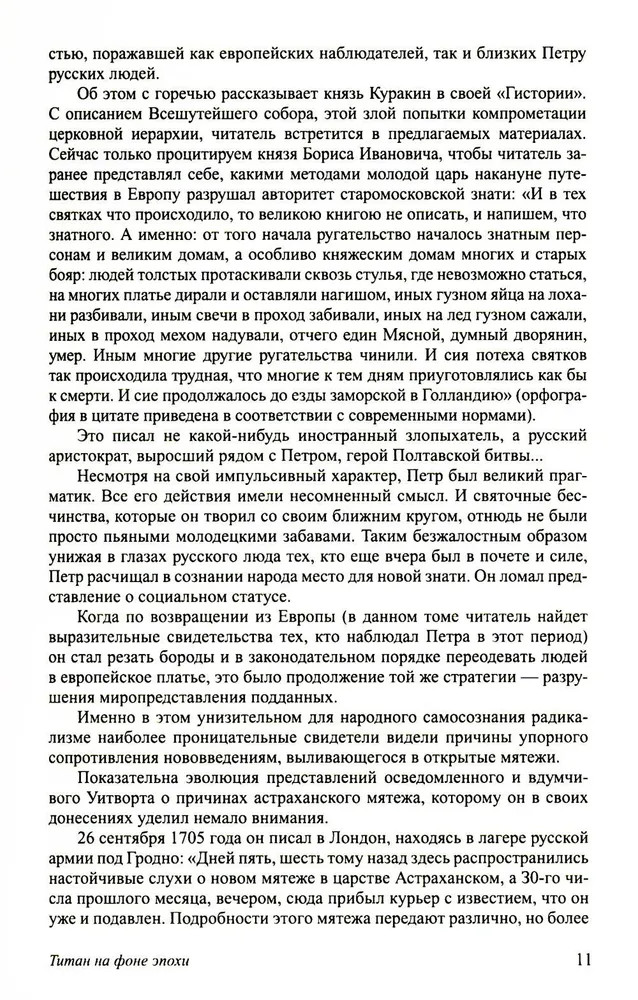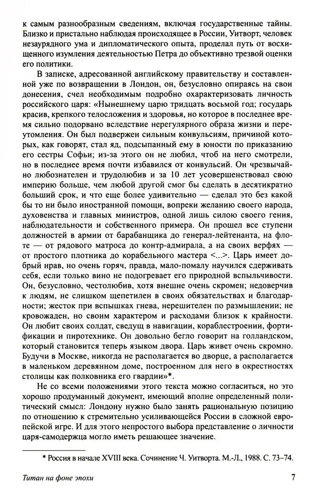 Серия: Государственные деятели России глазами современников «Куда мы ни оглянемся, везде встречаемся с этой колоссальной фигурою, которая бросает от себя длинную тень на все наше прошедшее...» писал 170 лет назад о Петре I историк М. П. Погодин. Эти слова актуальны и сегодня, особенно если прибавить к ним: «...и на настоящее». Ибо мы живем в государстве, основы которого заложил первый российский император. Мы наследники культуры, импульс к развитию которой дал именно он. Он сделал Россию первоклассной военной державой, поставил перед страной задачи, соответствующие масштабу его личности, и мы несем эту славу и это гигантское бремя. |