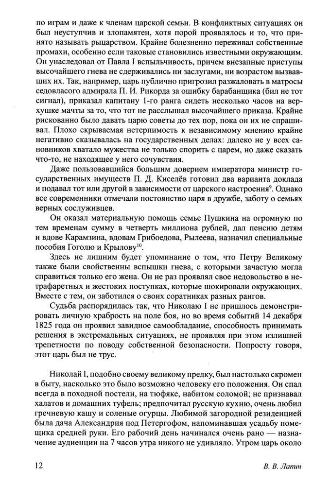 Серия: Государственные деятели России глазами современников Император Николай I был личностью глубоко незаурядной и столь же противоречивой. Он почитал себя искренним патриотом, жаждавшим осчастливить Россию и ее народ, и в то же время принес России немалые беды. Нежный муж и отец, способный на самые высокие человеческие чувства, он мог быть предельно безжалостен к тем, кого считал нарушителем установленных им законов. Истово верующий христианин, он оказался лишен главной христианской добродетели — умения прощать. Гордившийся своей прямотой и рыцарственностью, он не чурался лицемерия. Столь же значительным и противоречивым было и царствование Николая I. Небывалый взлет русской культуры — Пушкин, Гоголь, Лермонтов, молодой Достоевский. Но Пушкин и Лермонтов погибают. Гоголь кончает жизнь в тяжелой депрессии. Достоевский отправлен на каторгу. Царствование началось с громких побед в войнах с Персией и Турцией, было продолжено разгромом русскими войсками мятежей в Польше и Венгрии, но закончилось катастрофическим поражением в Крымской войне. Величественная и трагическая фигура императора, считавшего себя продолжателем дела Петра I, а также история его тридцатилетнего царствования заслуживают тщательного и объективного изучения. |
