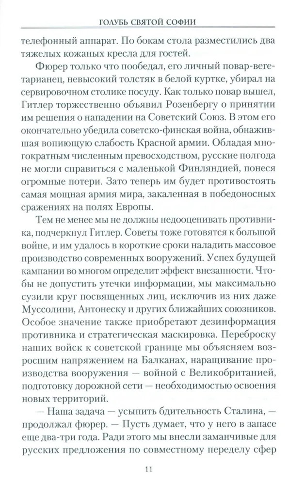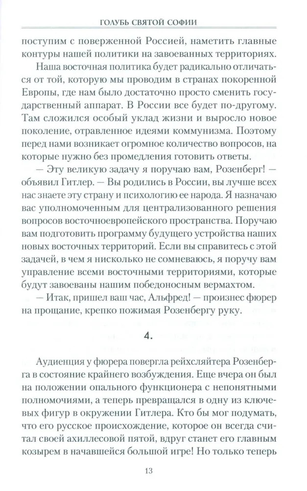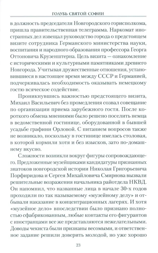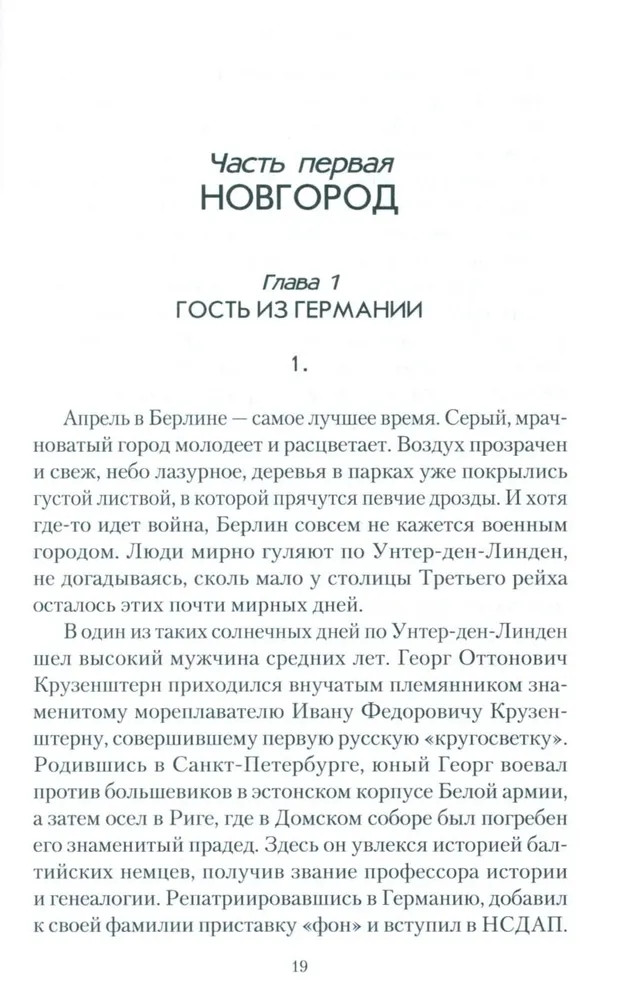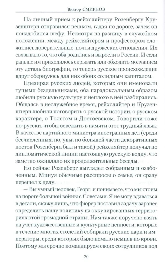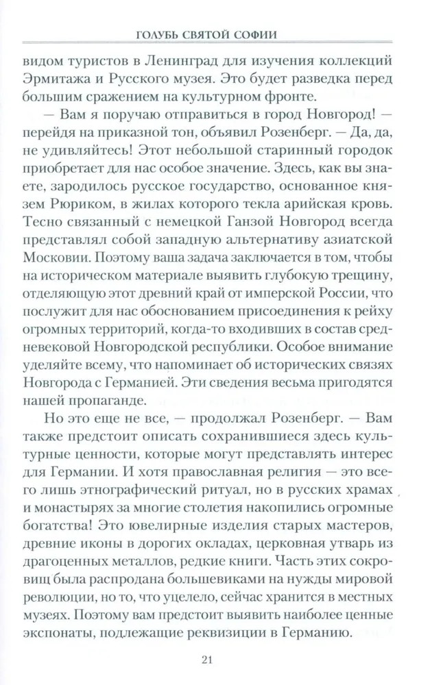Накануне нападения на Советский Союз фашистской Германии в древний Новгород с тайной миссией приезжает сотрудник Оперативного штаба рейхсляйтера Розенберга Георг фон Крузенштерн. Так начинается документальный роман писателя и историка Виктора Смирнова о событиях, происходивших на оккупированных территориях Новгородчины во время Великой Отечественной войны и в первые послевоенные годы. В основу романа положены реальные события. Это и героическая эпопея спасения музейных сокровищ, и судьбы тех, кто встал на путь сотрудничества с оккупантами, а также поиски золотого гроба Рюрика и удивительная история дочери новгородского бургомистра, ставшей придворной художницей английской королевы. Главная тема романа сбережение исторической памяти, которая помогает русским людям пережить страшные испытания и остаться людьми. |