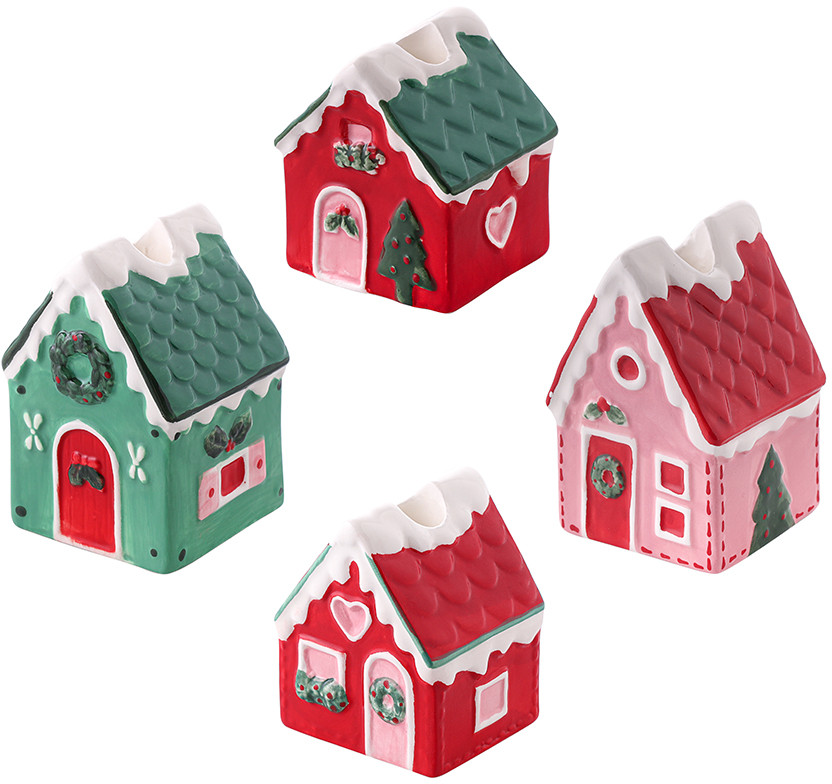 • домики идеально смотрятся в качестве моно-декора или в композиции с елочными шарами, мишурой и другими тематическими элементами дизайна.